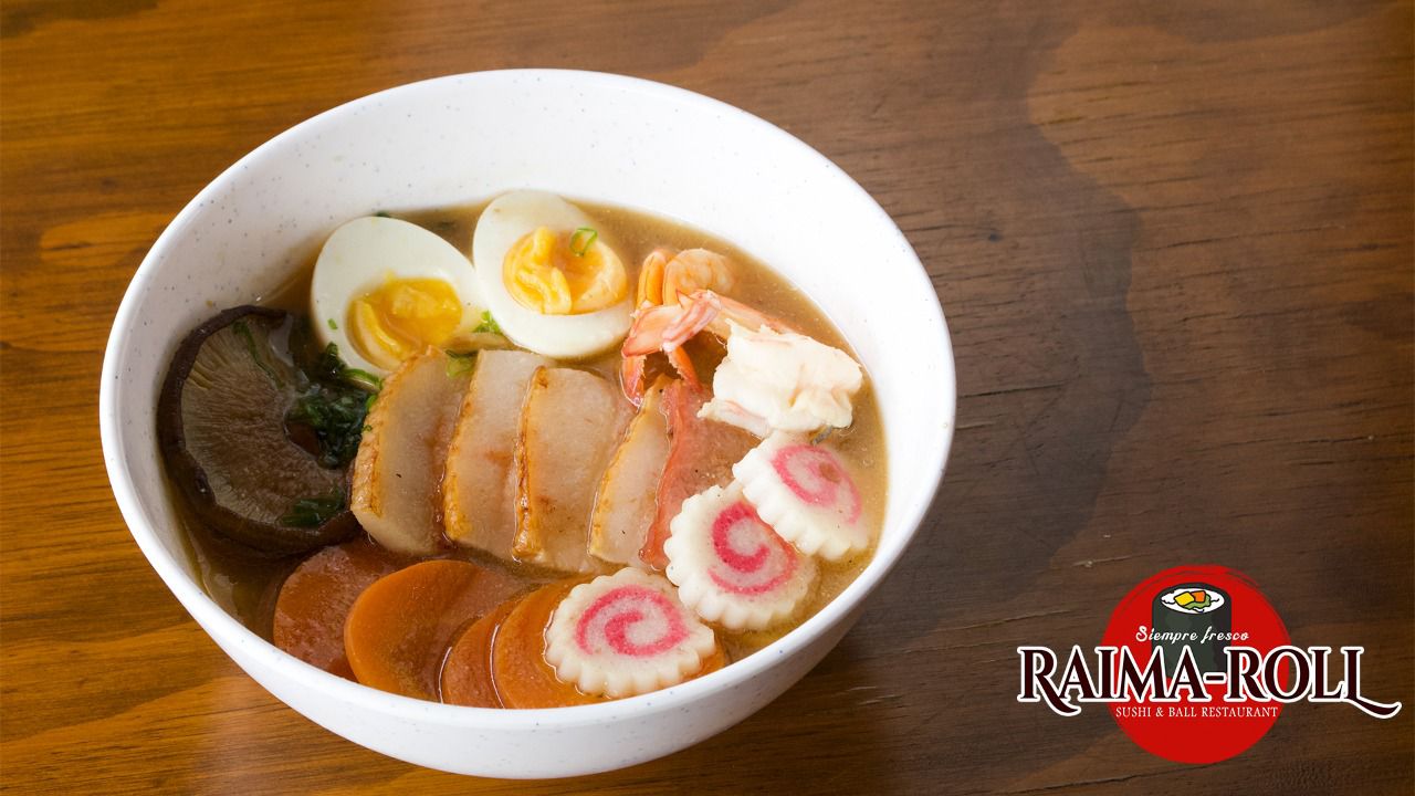 base de consomé de pollo y misoshiru, servido con huevo zanahoria, espinaca, lechuga, nori, shitake, tallarin udon salteado, y pollo en salsa ika tori