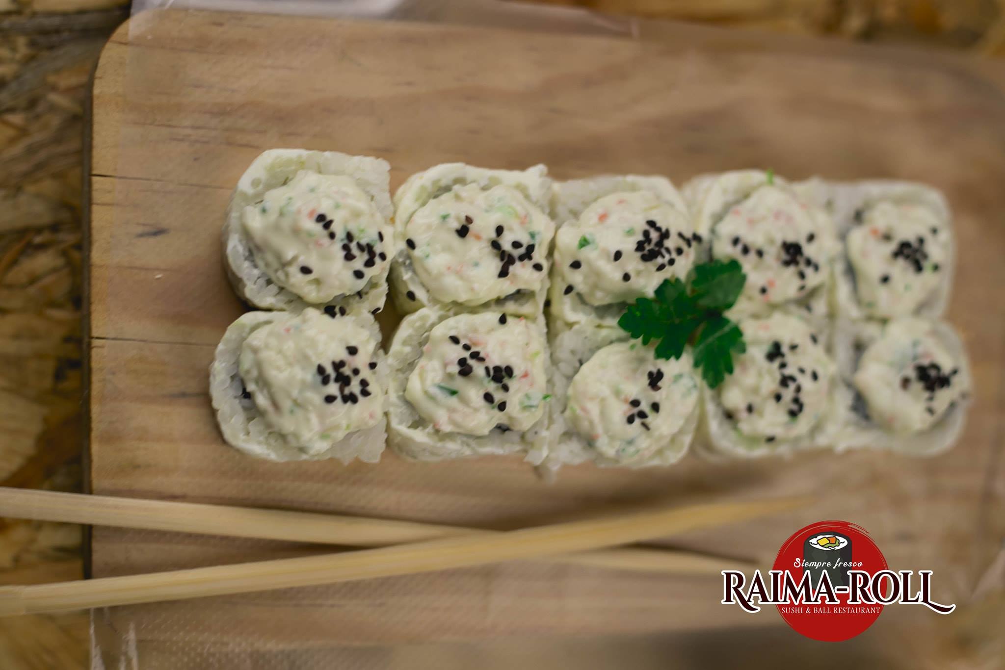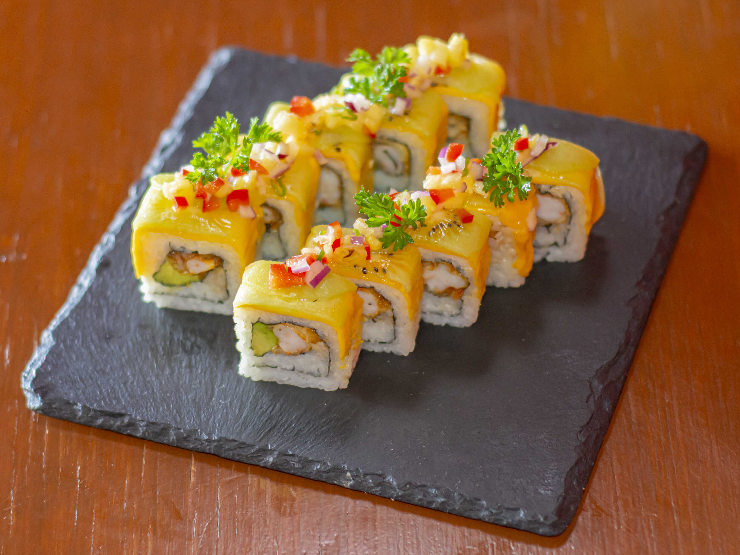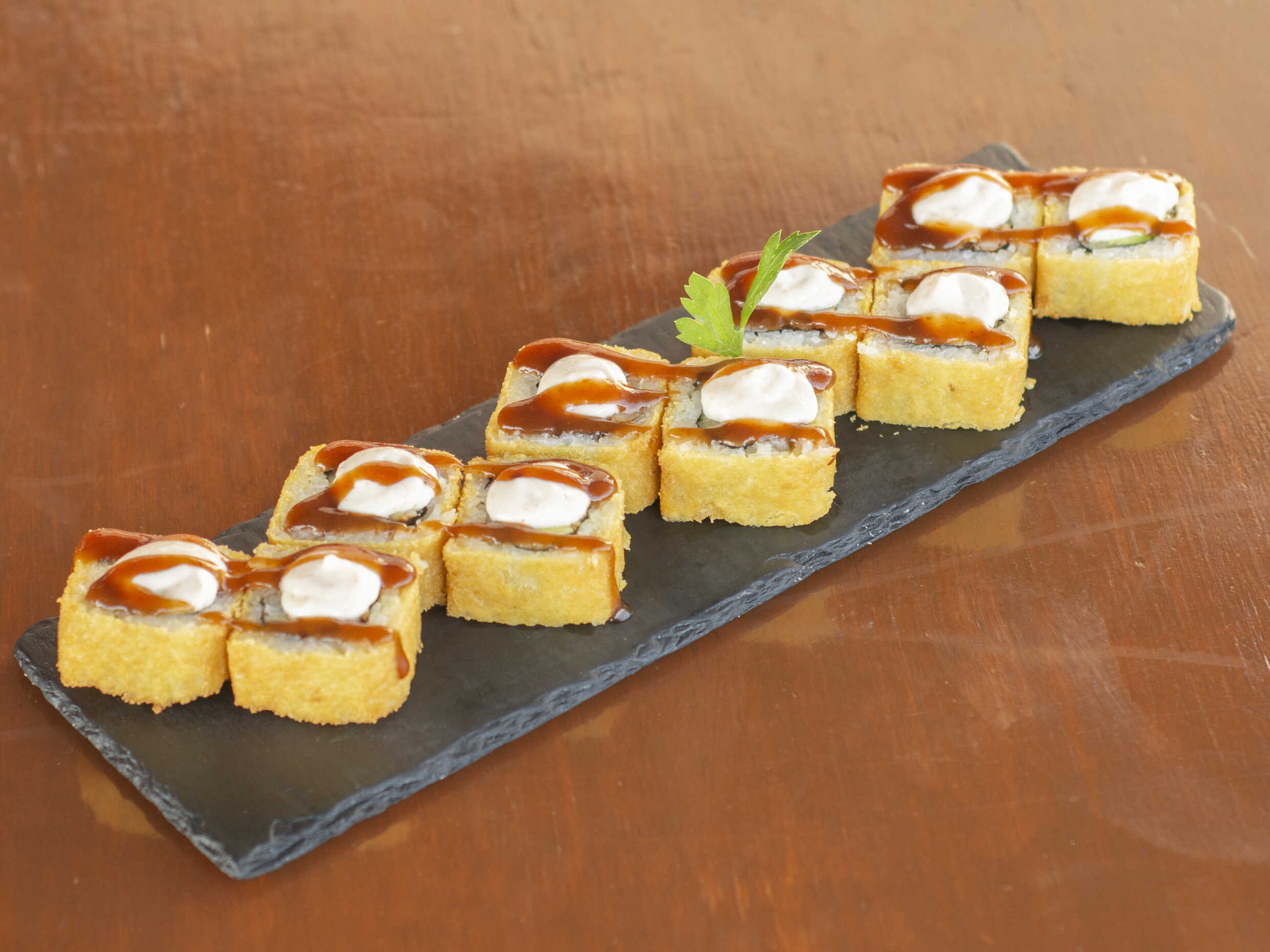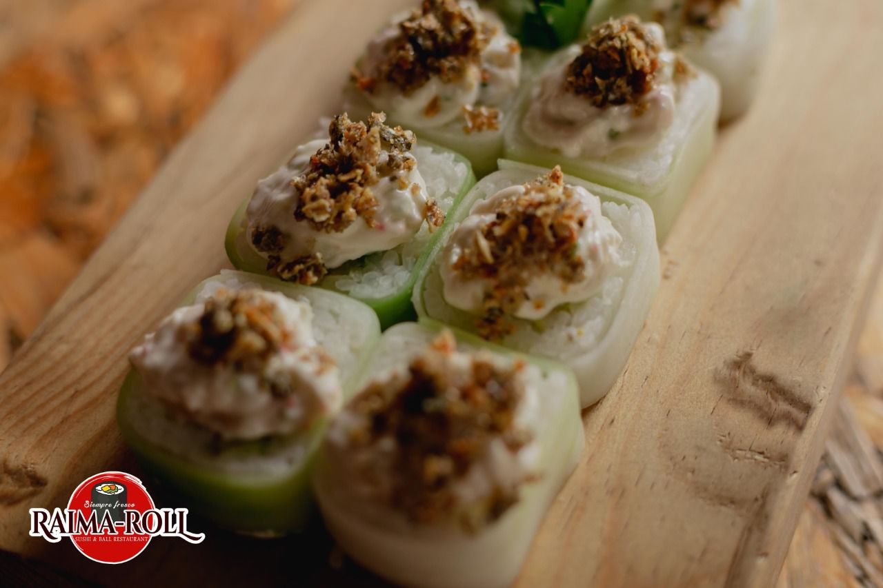 Envuelto en alga con camarón empanizado, pepino, aguacate, queso Philadelphia, salsa sriracha. Bañado en chipotle, masago y cebollines.