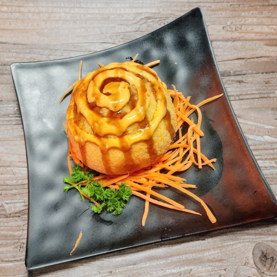 Proteina: Pulpo. Bola de arroz empanizada, rellena de tampico, aguacate y Philadelphia, bañado en salsa kushiague y chipotle.