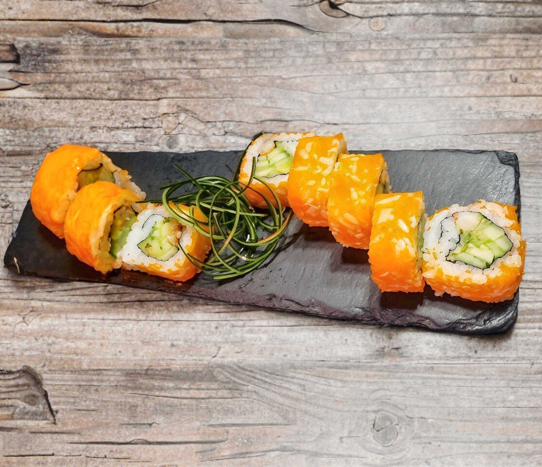 Rollo envuelto en salmón a la plancha sazonado y queso Philadelphia, bañado en salsa teriyaki y un toque de salsa chipotle, por dentro zanahoria capeada aguacate. Cortado en 10 piezas