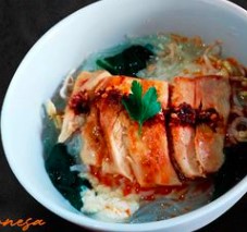 Sopa de pollo y huevo, acompañado de fideo harusame, moyashi, gohan, espinaca, pechuga de pollo sazonada a la plancha, bañada en salsa ika.