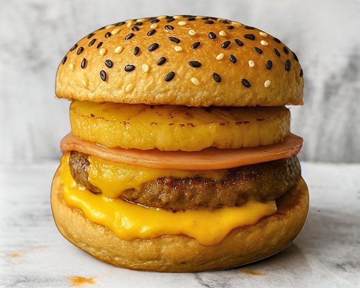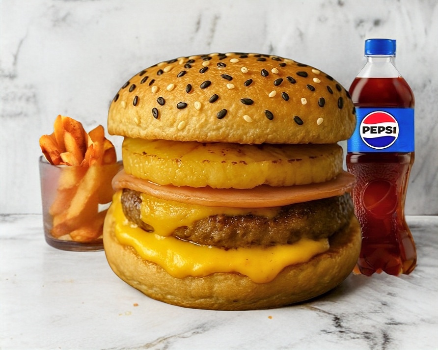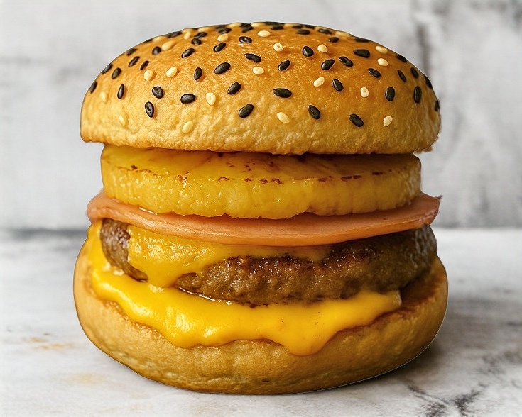 Hamburguesa a la Plancha con 1/4 de Libra de Carne 100% de Res coronada con Auténtico Queso Americano, Piña asada a la plancha, jamón y acompañada pepinillos.