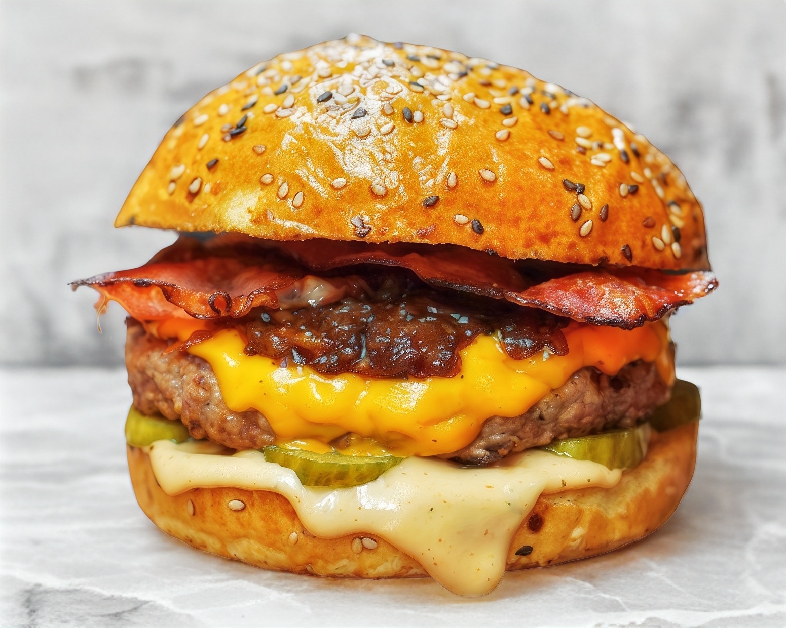 Hamburguesa a la Plancha con 1/4 de Libra de Carne 100% de Res coronada con 1 rebanada de Auténtico Queso Americano, Mermelada de Tocino, Tocino Crujiente, pepinillos y Aderezos.