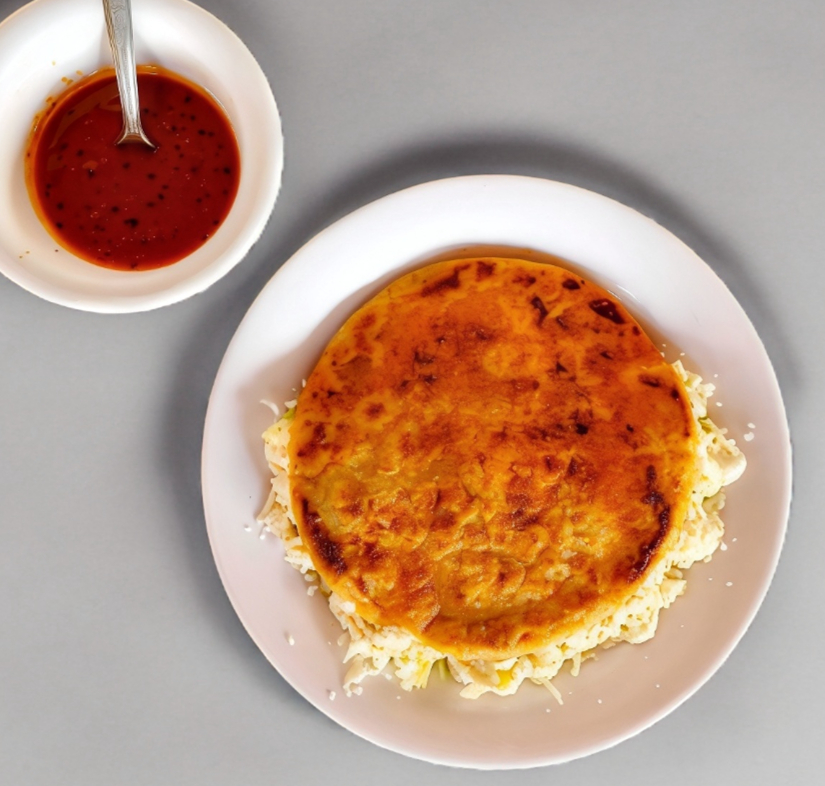 Gorda de papas con rajas gigante con crema, queso rayado, lechuga y salsa.