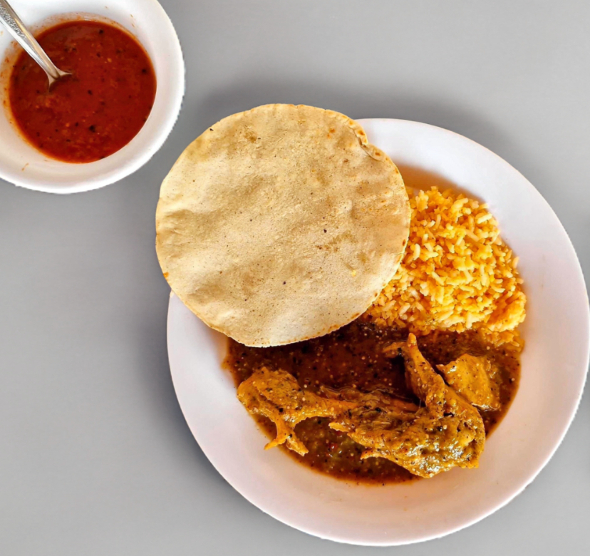 Taco acorazado de pollo en salsa, con arroz, tres tortillas hechas a mano, y salsa.