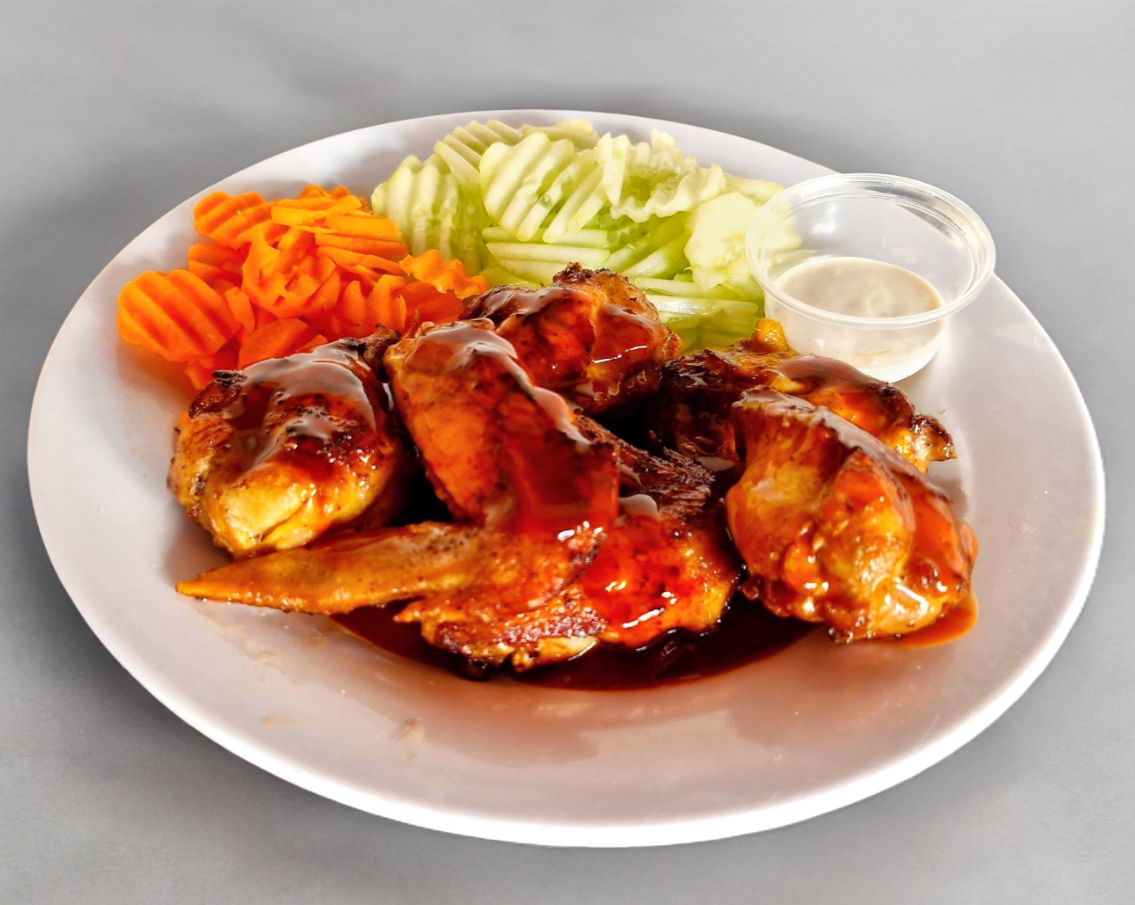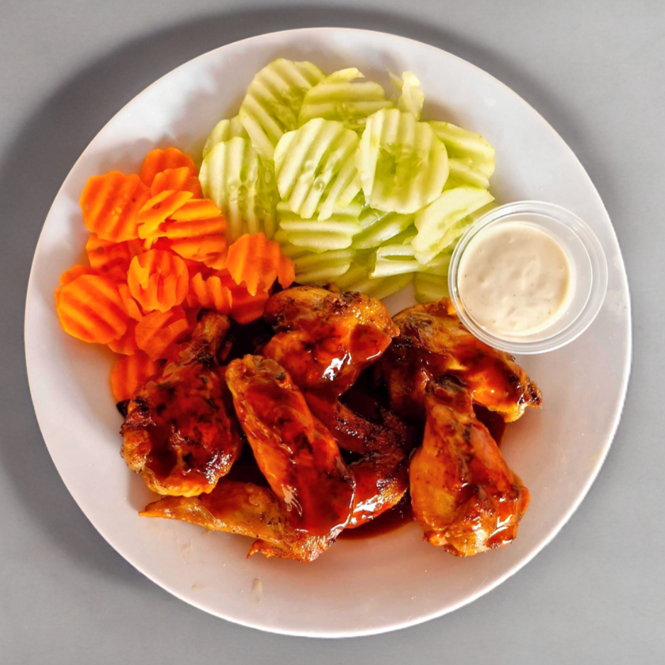 Alitas BBQ con pepino, zanahoria y aderezo ranch (6 piezas).