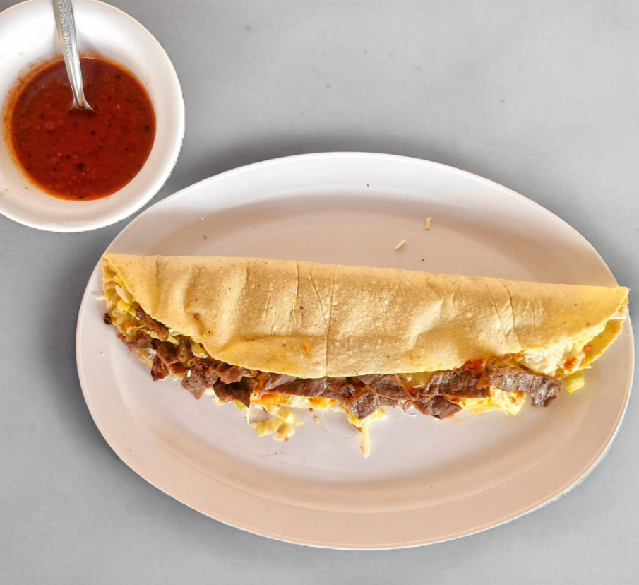 Quesadilla de bistec gigante con crema, queso rayado, lechuga y salsa.