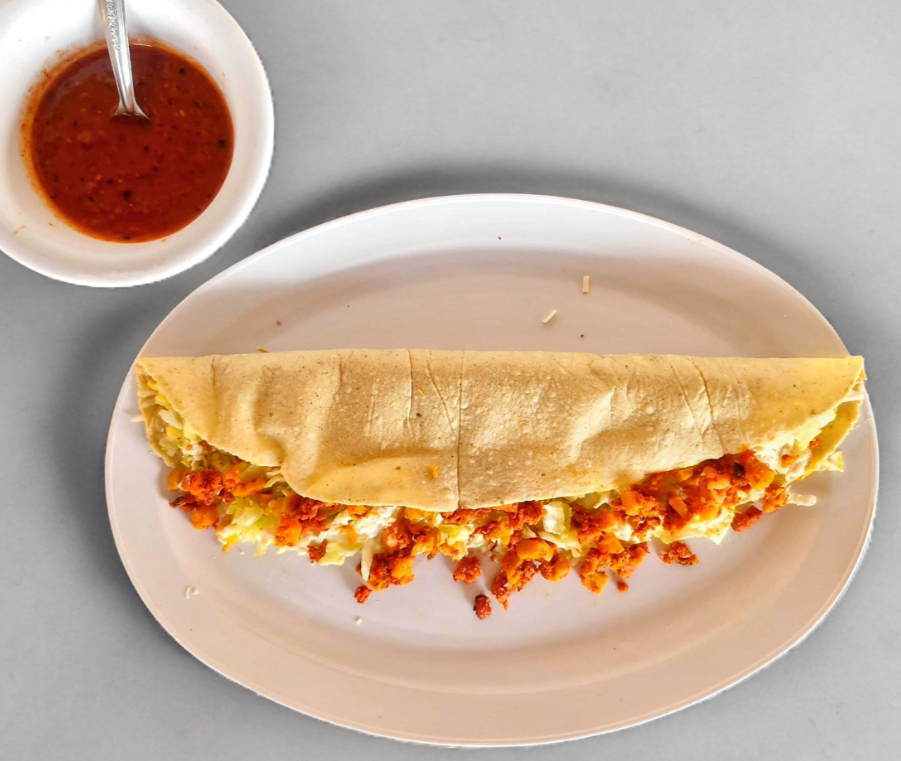 Taco acorazado de huevo duro, con arroz, tres tortillas hechas a mano, y salsa.