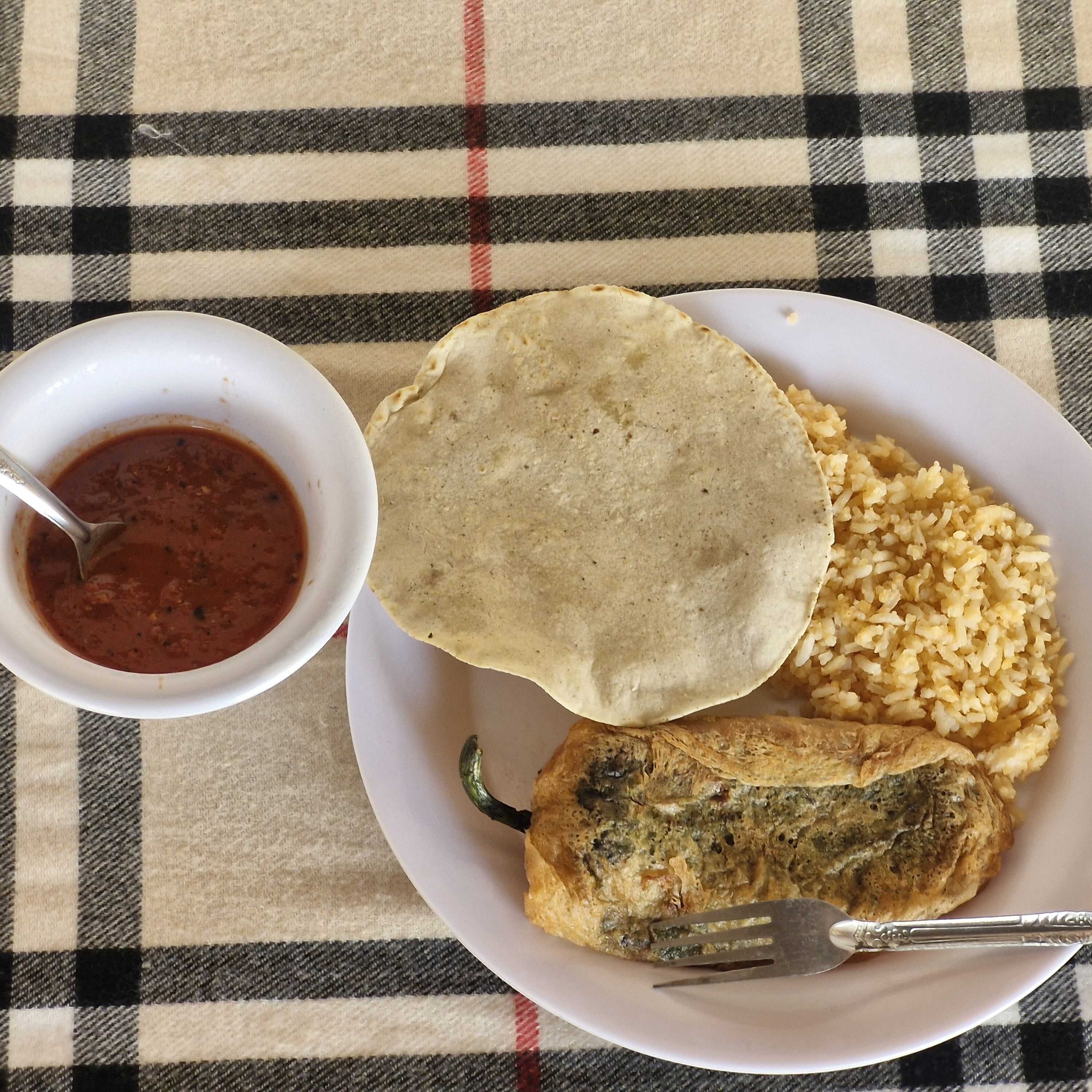 Taco acorazado de chile relleno, con arroz, tres tortillas hechas a mano, y salsa.