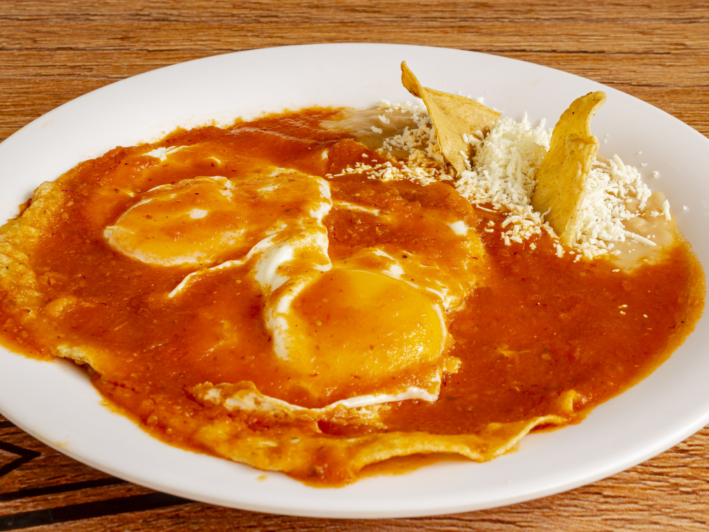 2 Huevos estrellados sobre tortilla de maíz, bañados en salsa roja. Acompañados de frijoles refritos. Incluye café americano o de la olla y agua de sabor o fruta.