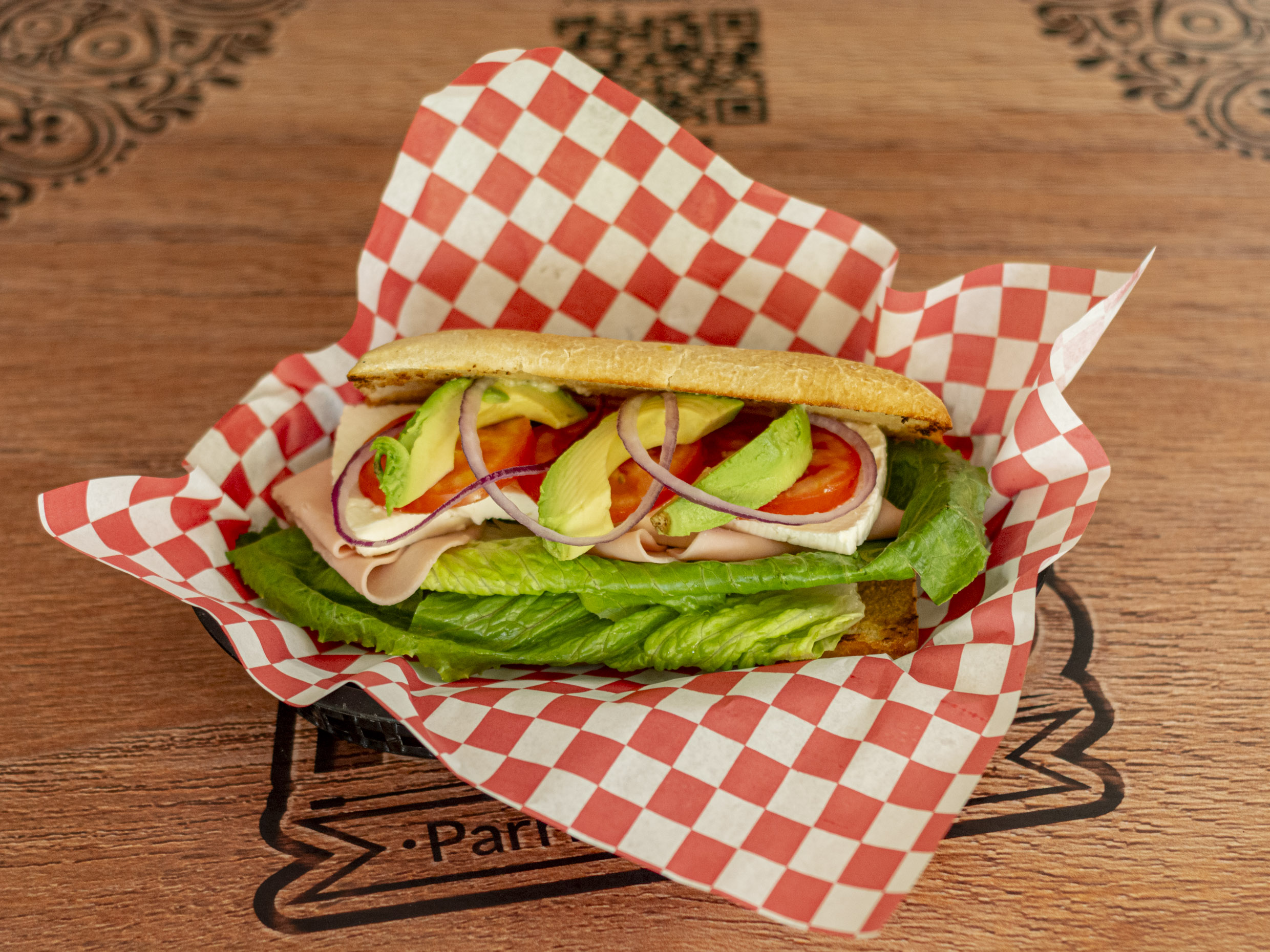 Con lechuga, jitomate, aguacate, cebolla morada, mayonesa y mostaza. Acompañada con Chiles en vinagre de la casa