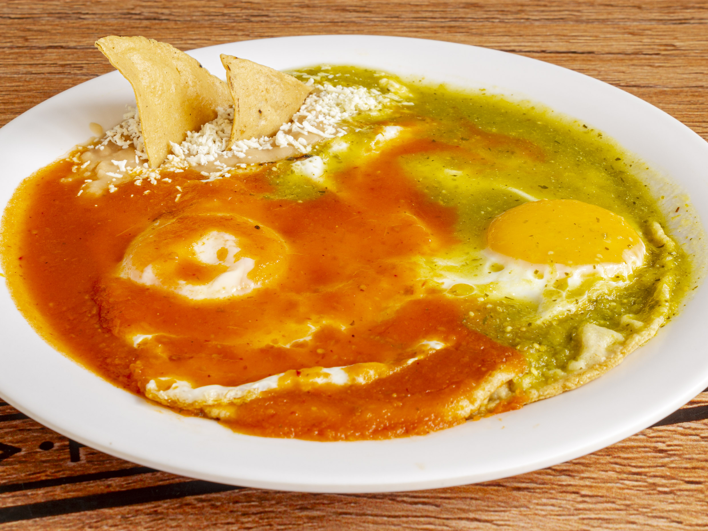 2 Huevos estrellados sobre tortilla de maíz, bañados en salsa verde y roja. Acompañados de frijoles refritos. Incluye café americano o de la olla y agua de sabor o fruta.