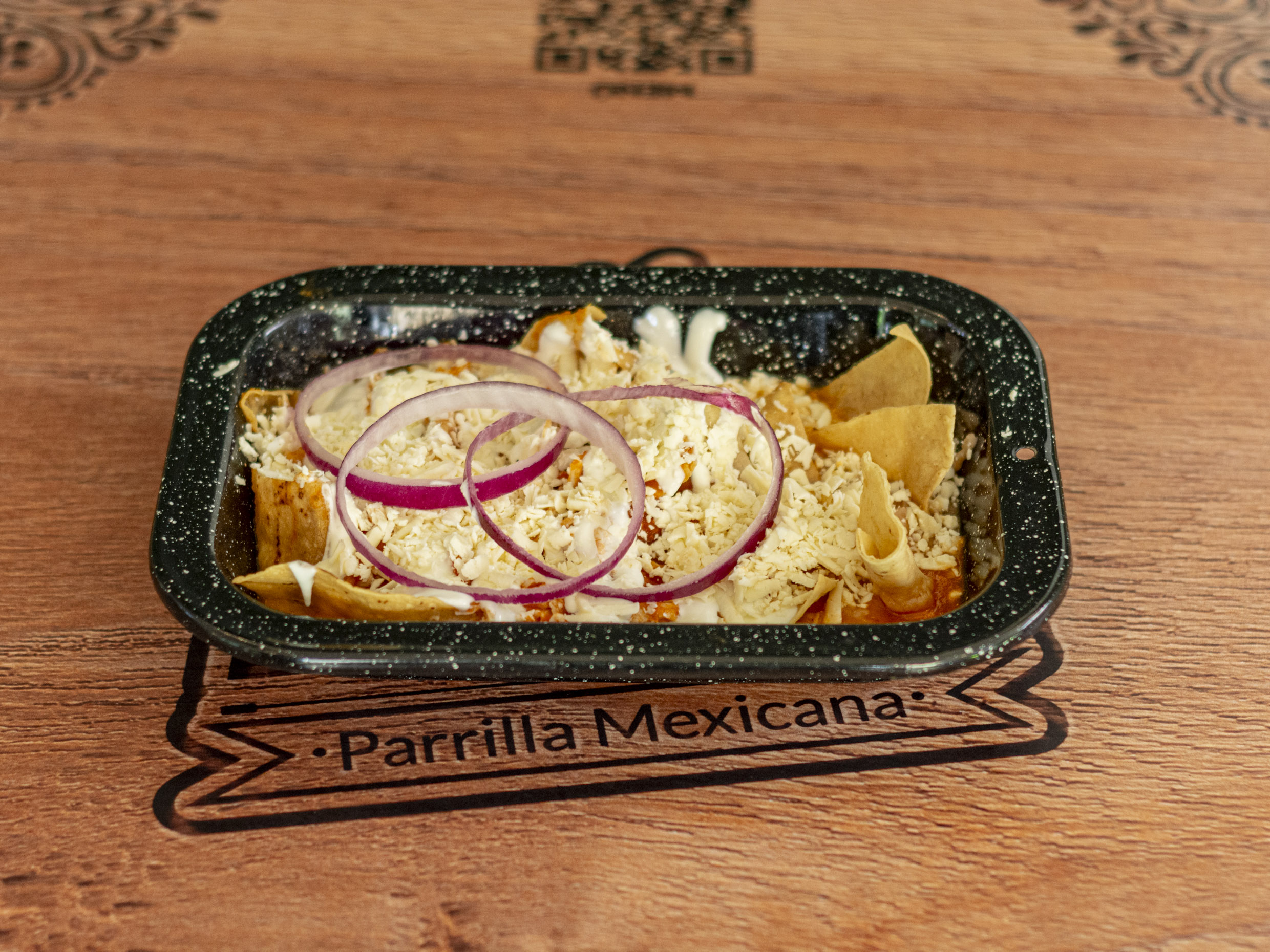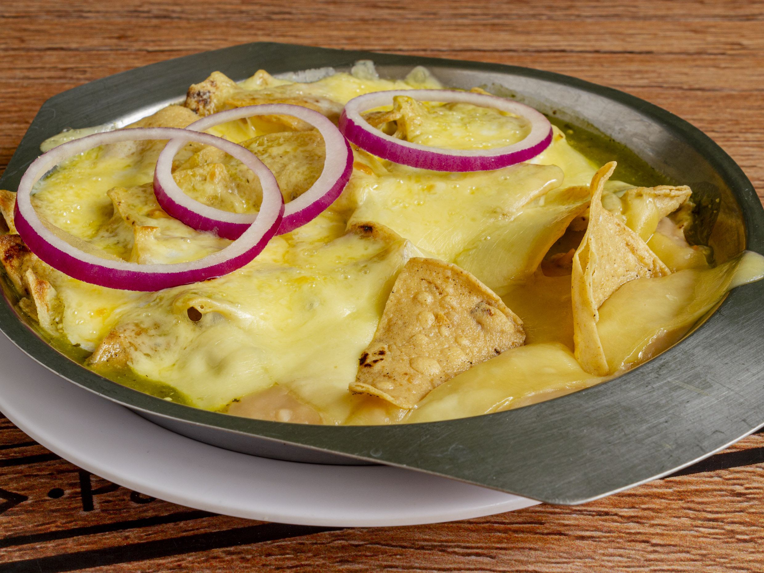 Preparadas en salsa verde o mole. Con queso chihuahua gratinado, cebolla, crema y una guarnición de frijoles refritos.