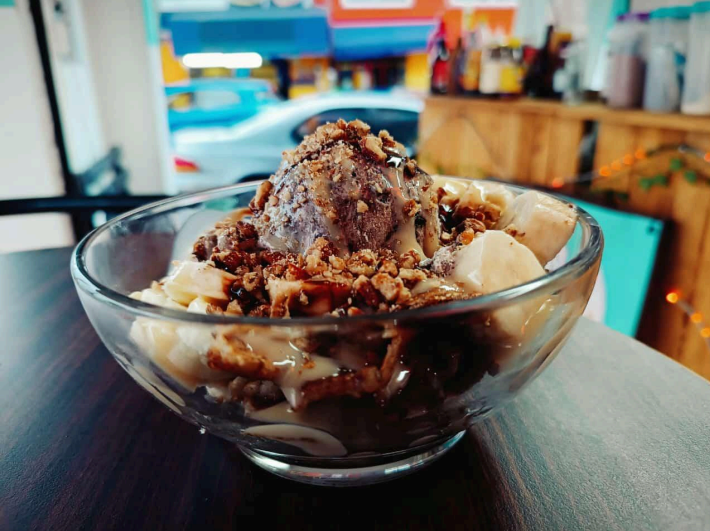 Bowl de crepa en trocitos como base, dos bolas de helado, fruta, shopping y una cubierta externa.
