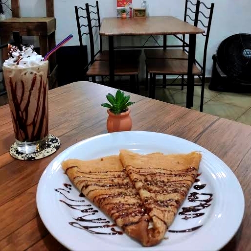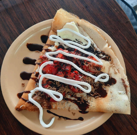 (Crepa de masa artesanal rellena de queso philadelphia y Nutella. Arriba lleva hershey's, fresa, chispas de chocolate con café y crema batida sabor vainilla)