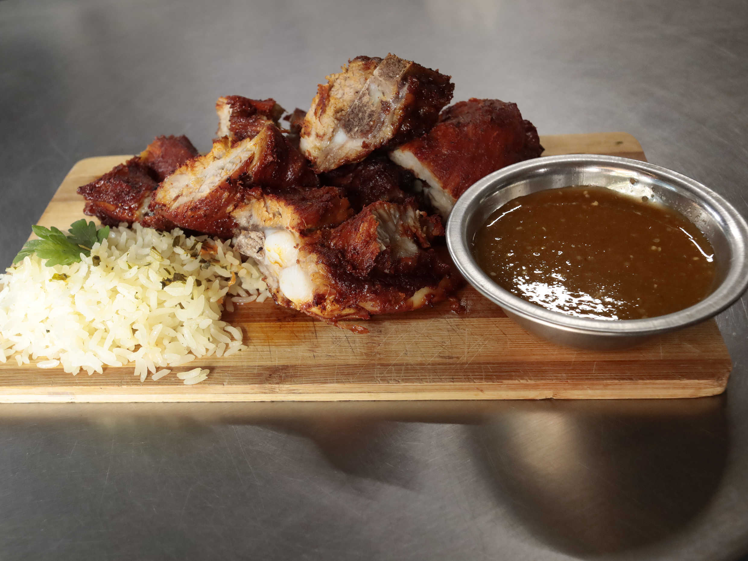 Costilla de cerdo adobada y rostizada, con complementos que lleve el pollo.