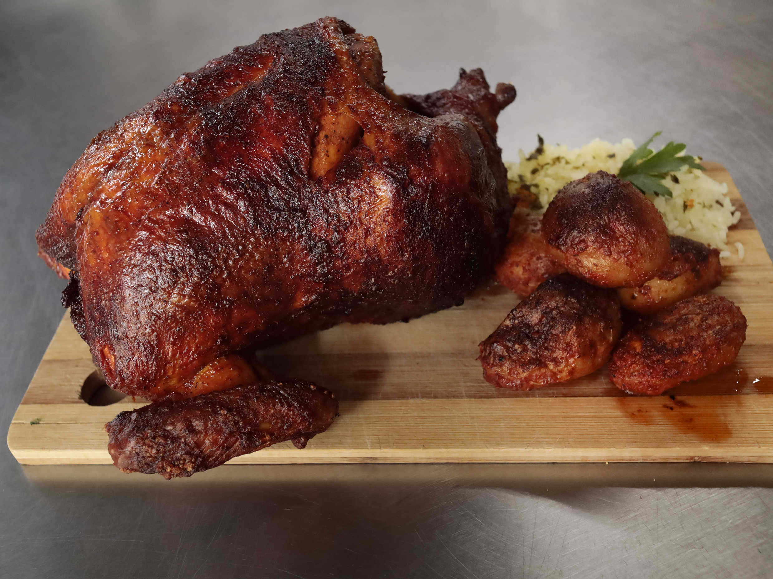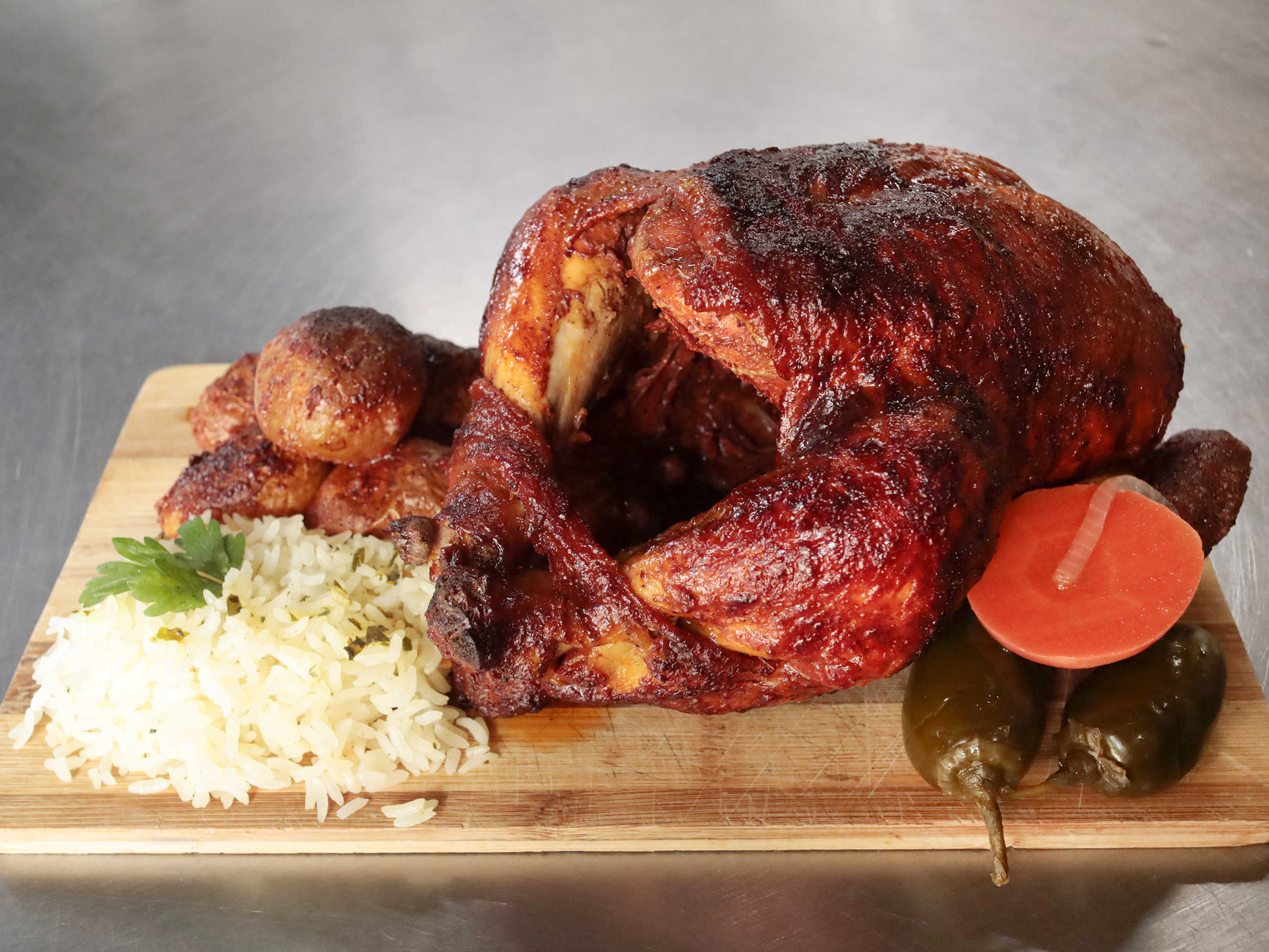 Pollo rostizado tamaño grande acompañado con arroz, papas en gajo, salsa y chiles.