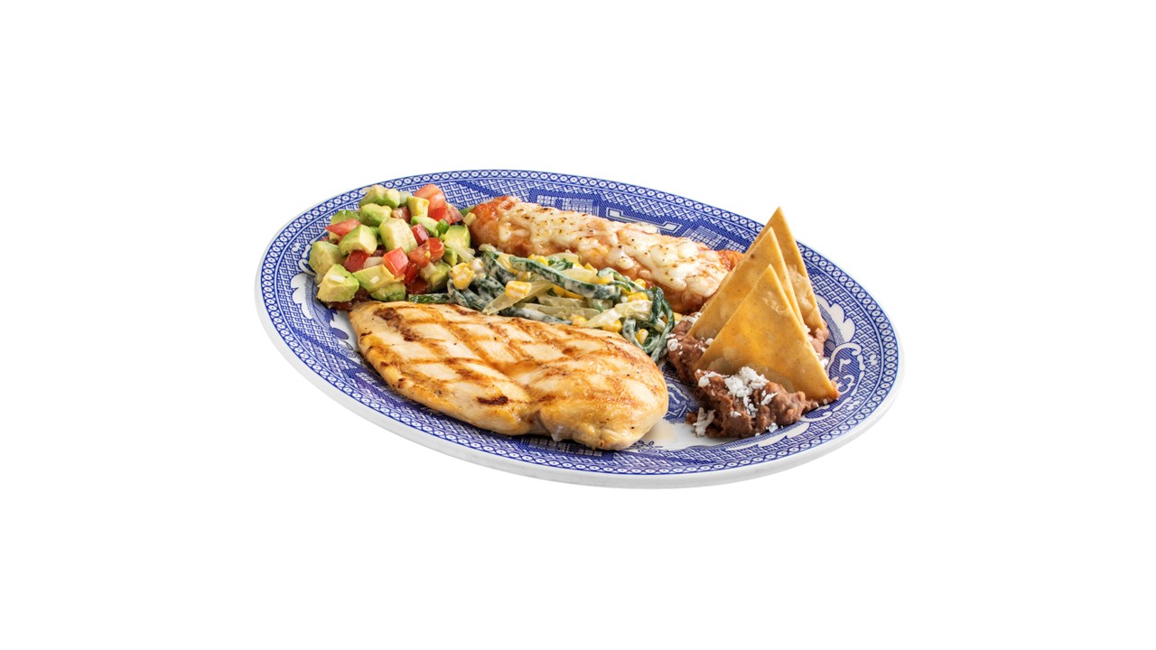 Con enchilada de queso, rajas poblanas a la crema, frijoles refritos y guacamole.