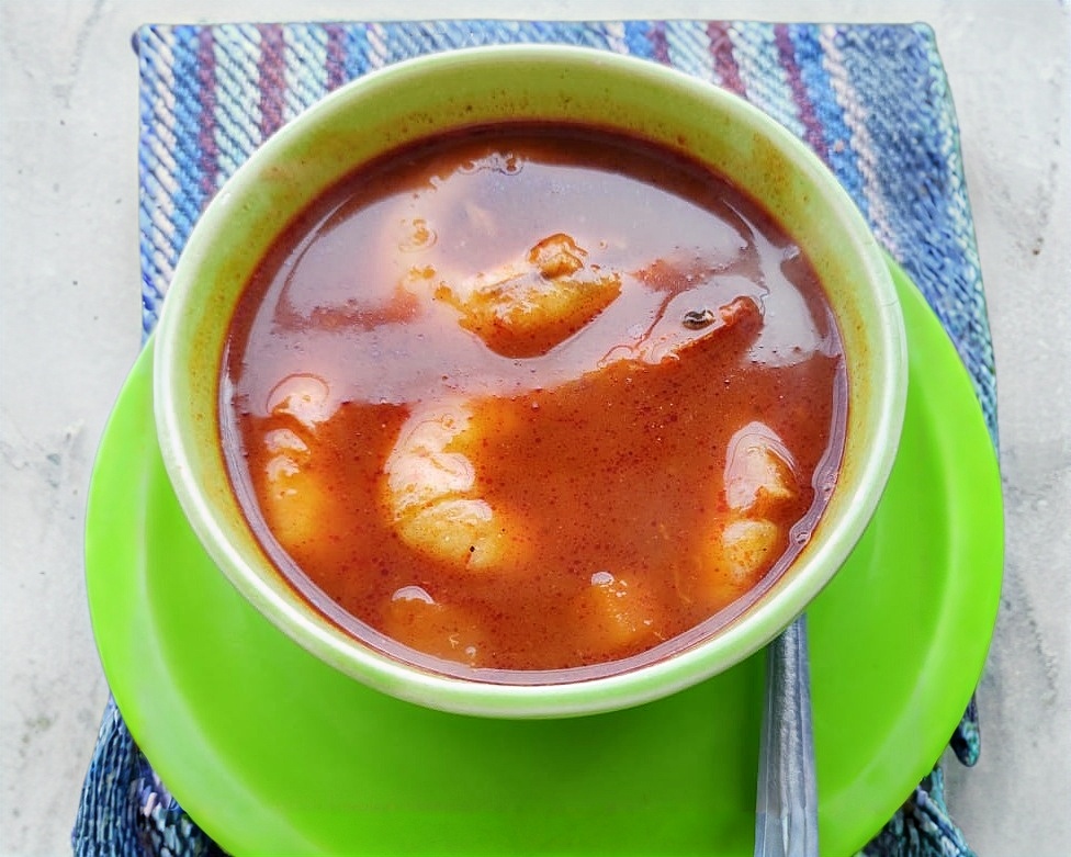 MEDIO LITRO DE CALDO ROJO CON VERDURA Y CAMARON FRESCO "2 pz" (incluye cebolla y limon)