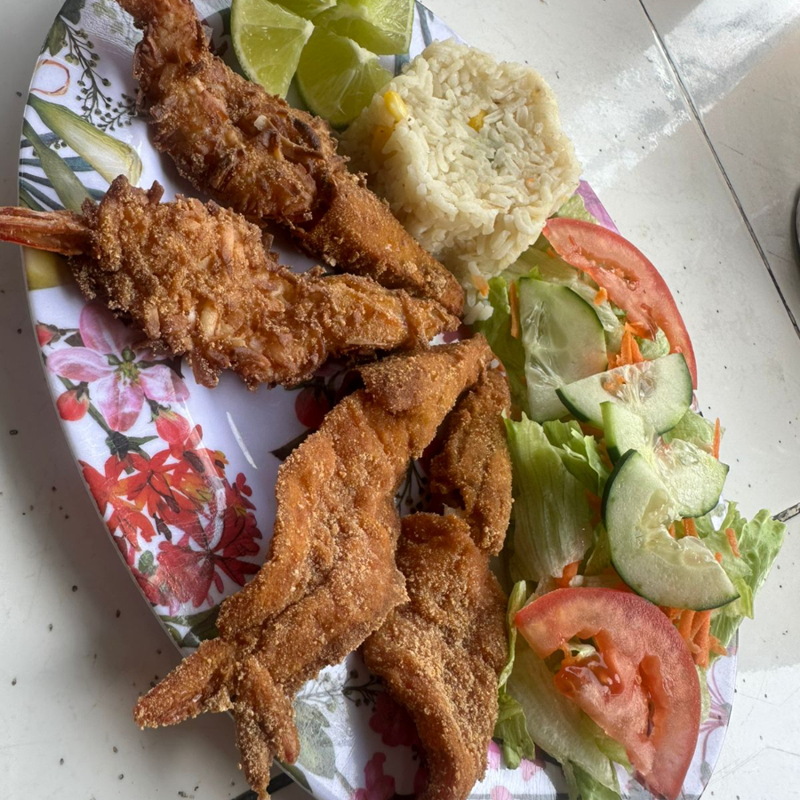 4 PZ DE CAMARON FRESCO FRITOS AL COCO CON ARROZ Y ENSALADA porc. ind.