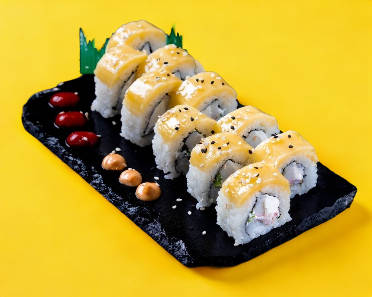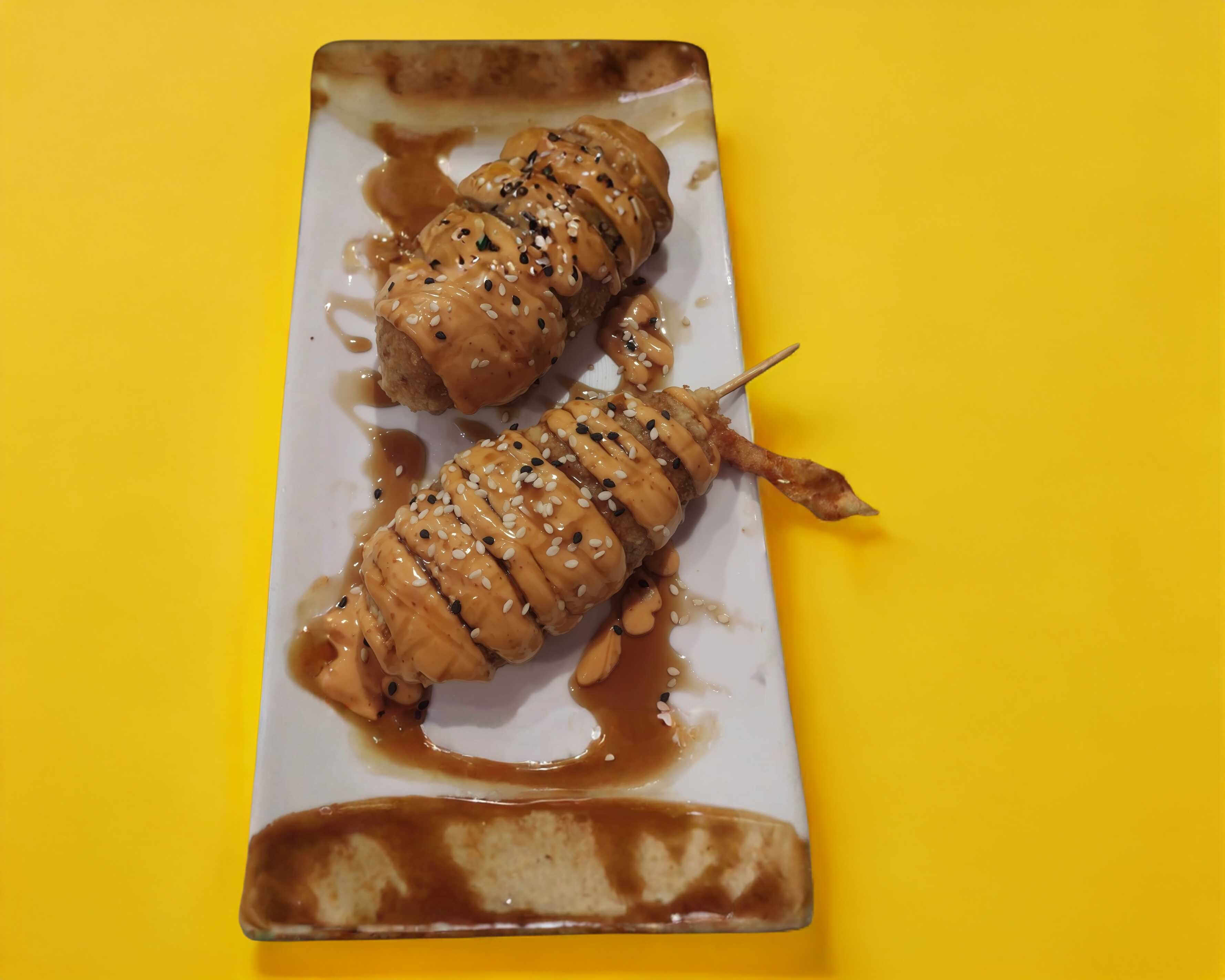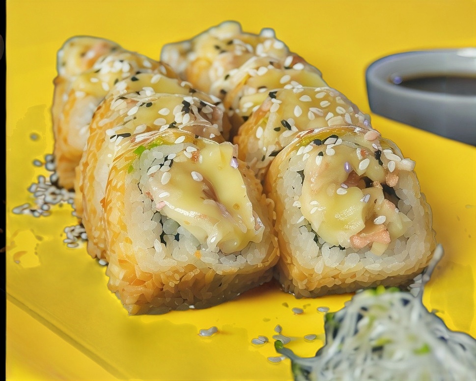 Por dentro: camarón, queso Philadelphia, chiles toreados y kanikama. Por fuera: forrado de queso mozzarella.