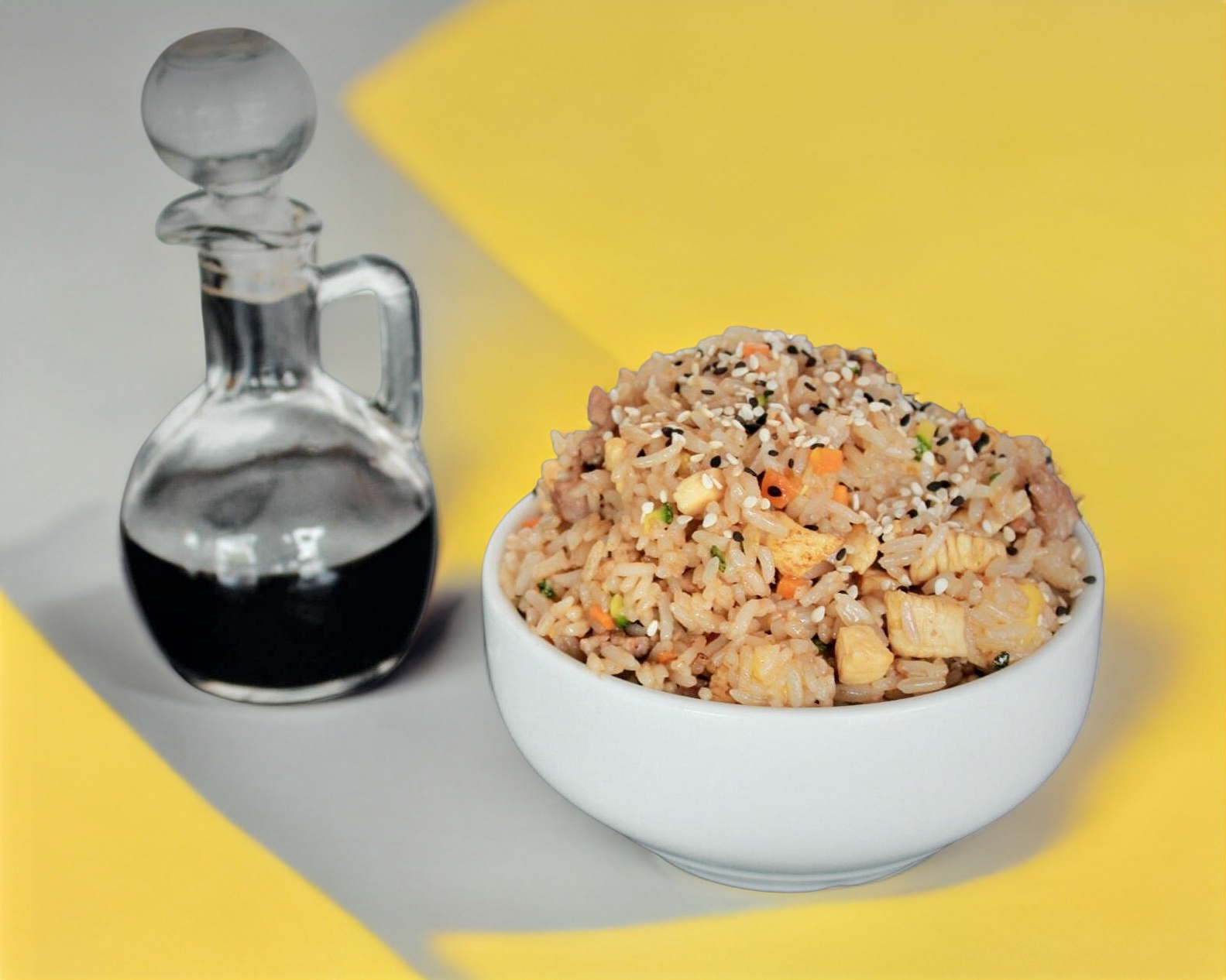 Arroz frito con huevo, germen de soya y verduras.