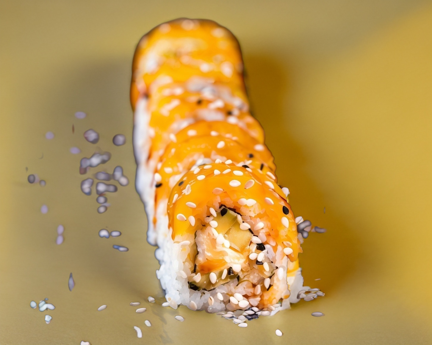 Por dentro: queso Philadelphia, pepino y aguacate. Por fuera: queso Philadelphia y ajonjolí.