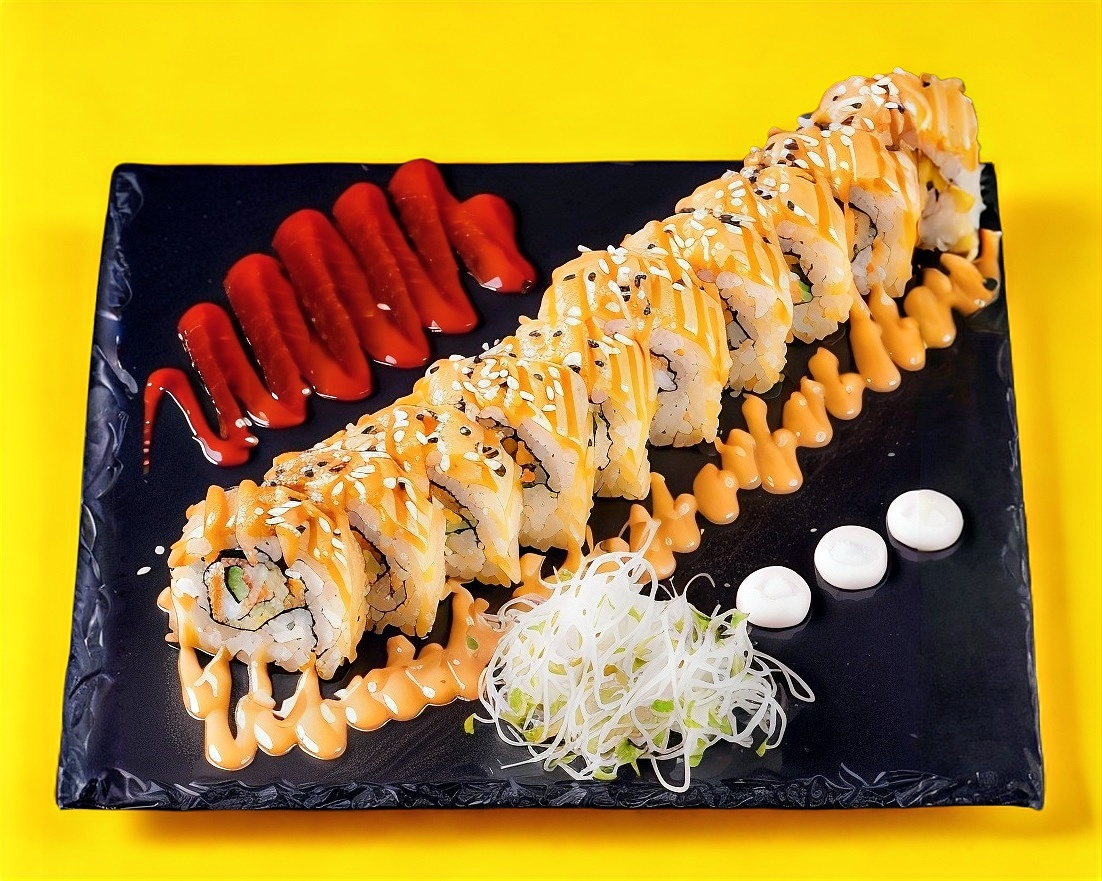 Dentro: cangrejo, salmón, atún y queso Philadelphia. Fuera: forrado de salmón y bañado en salsa Tampico.