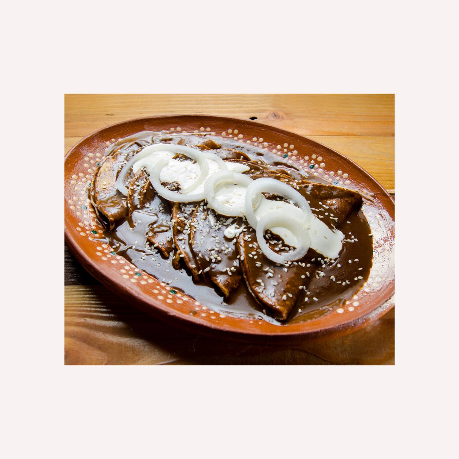 Bolillo,totopos de maiz, salsa verde, cebolla, queso y crema .