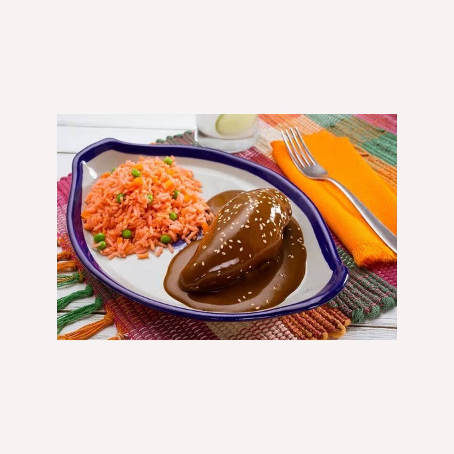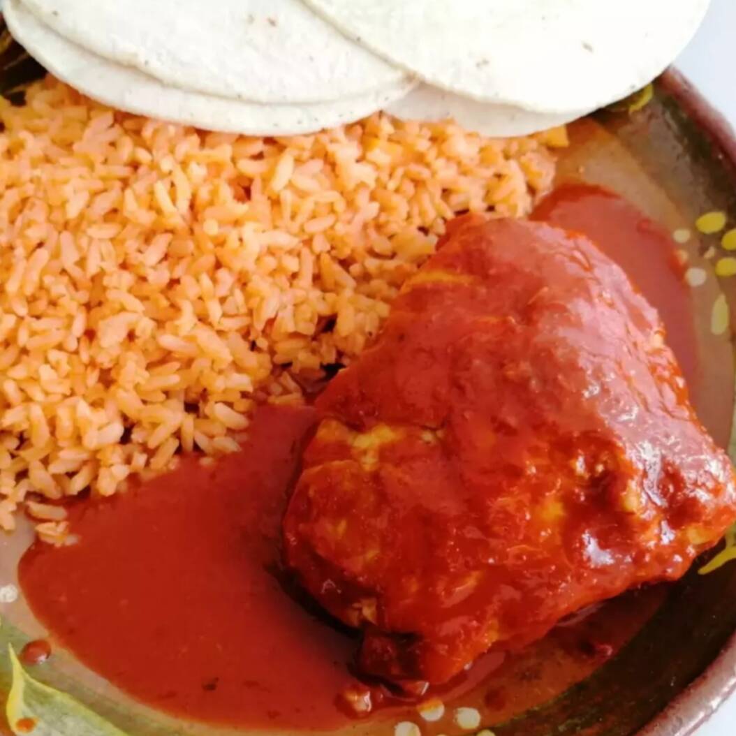 4 pz. de pollo en salsa roja, frijoles y arroz