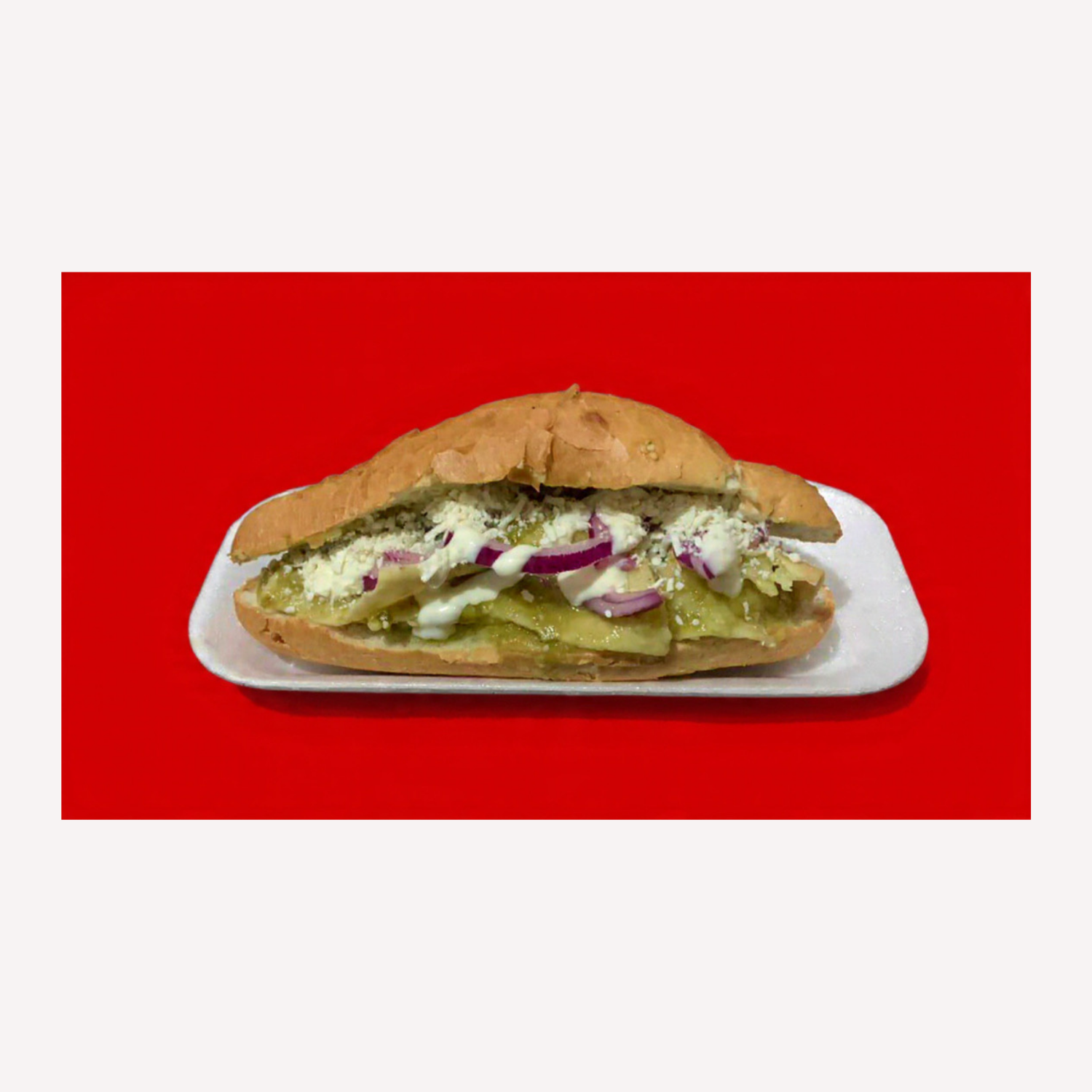 Bolillo, salsa verde, cebolla, queso y crema y milanesa de pollo.