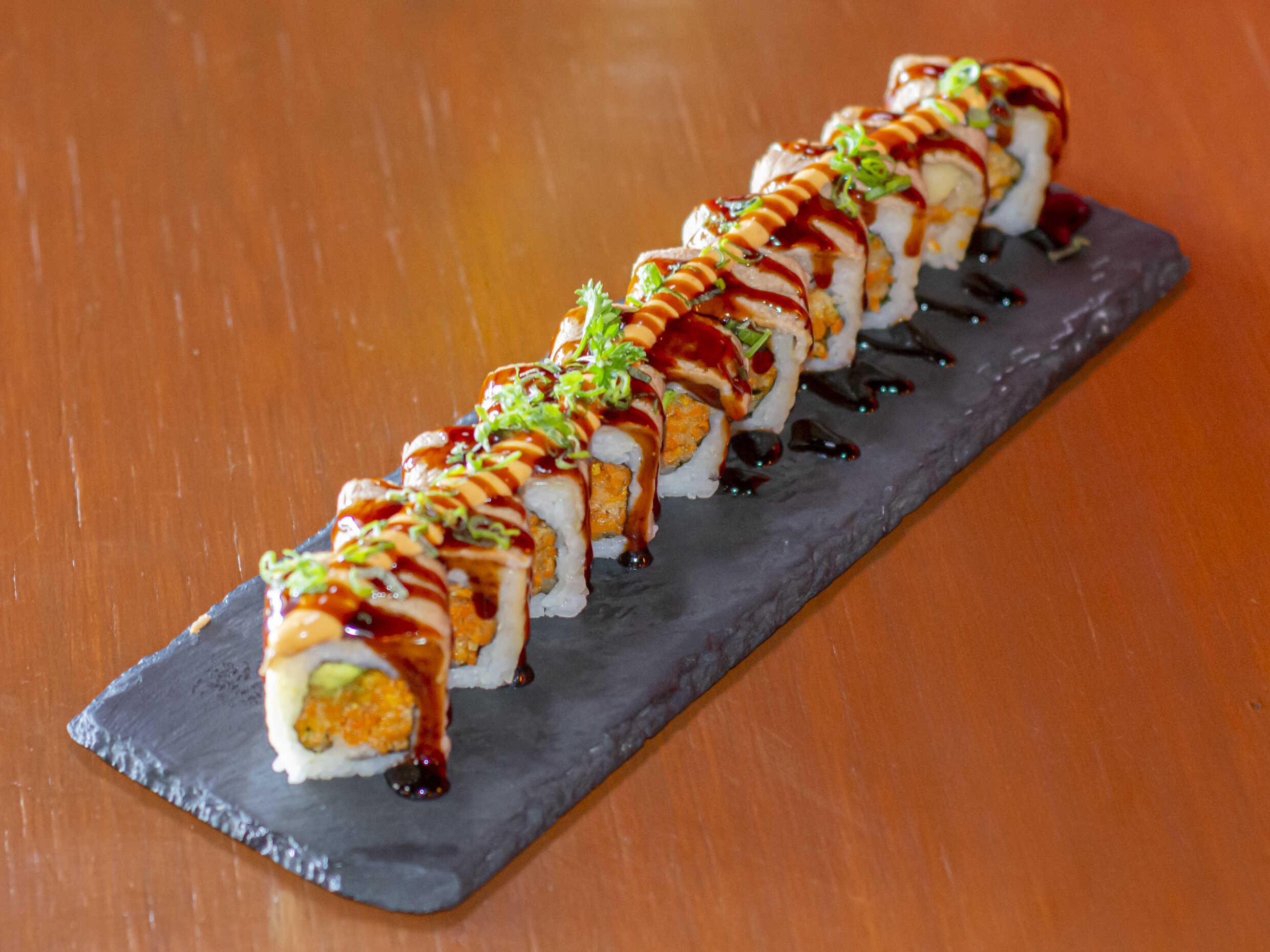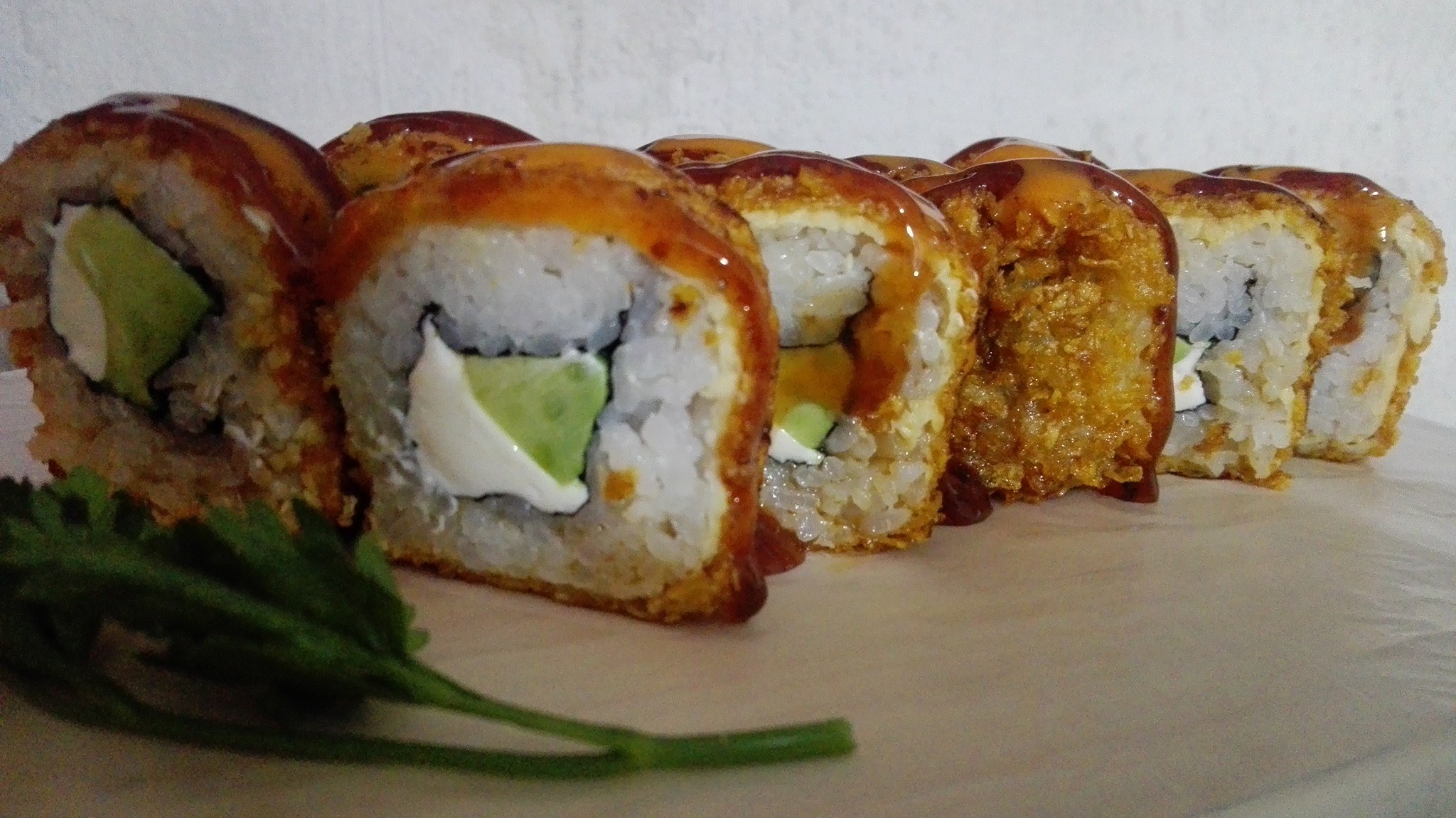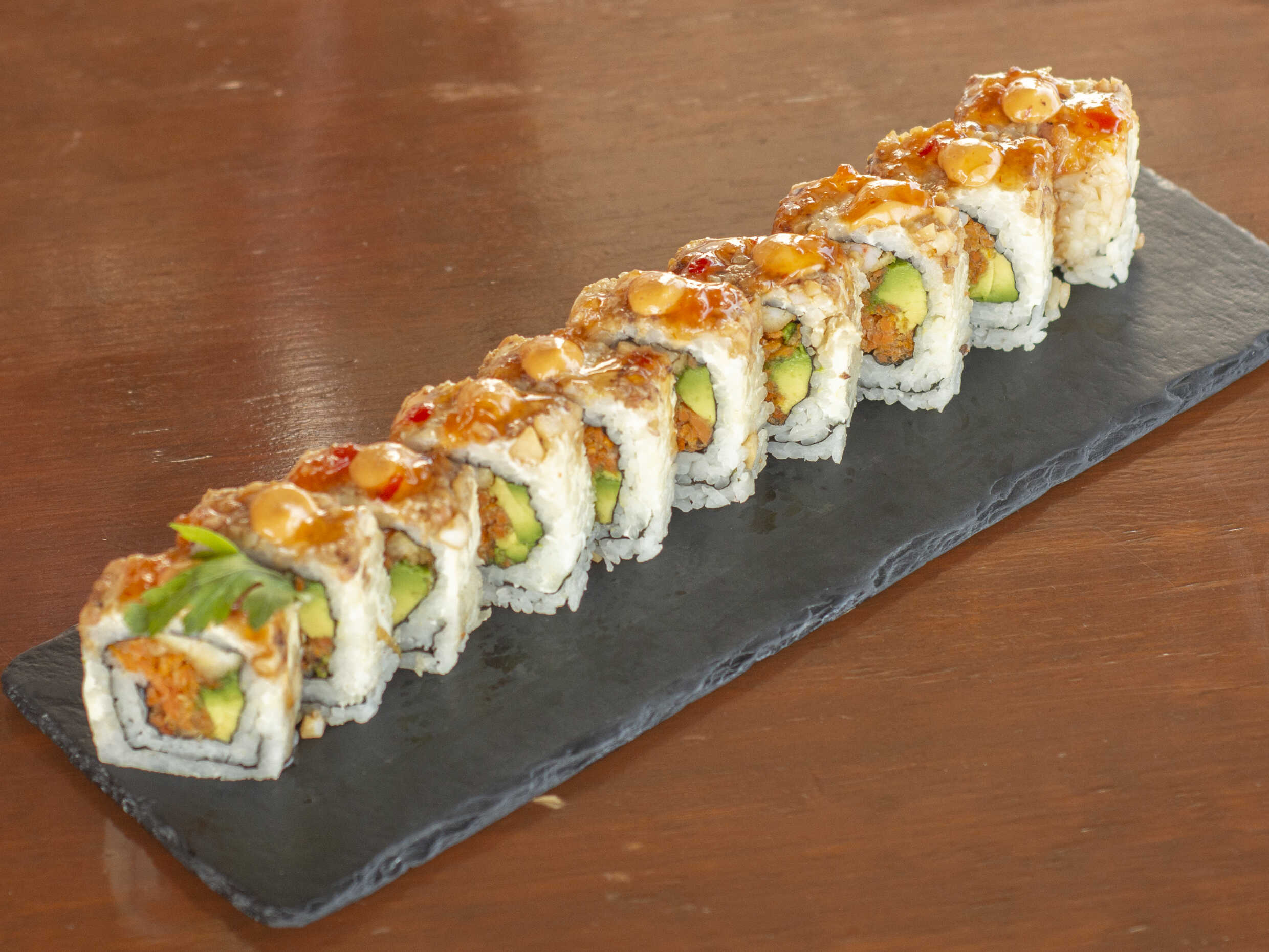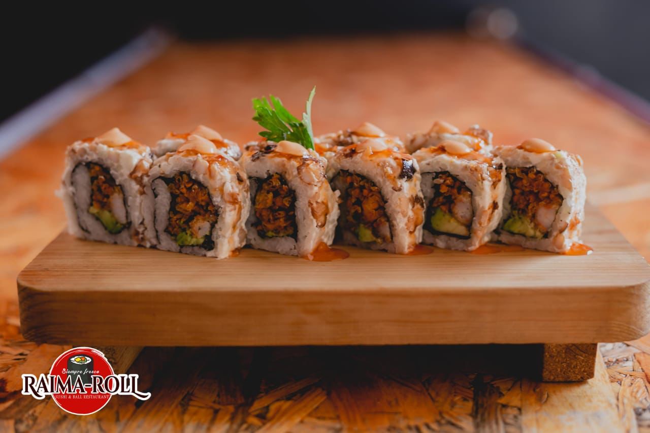 Envuelto en alga con camarón empanizado, pepino, aguacate, queso Philadelphia, salsa sriracha. Bañado en chipotle, masago y cebollines.