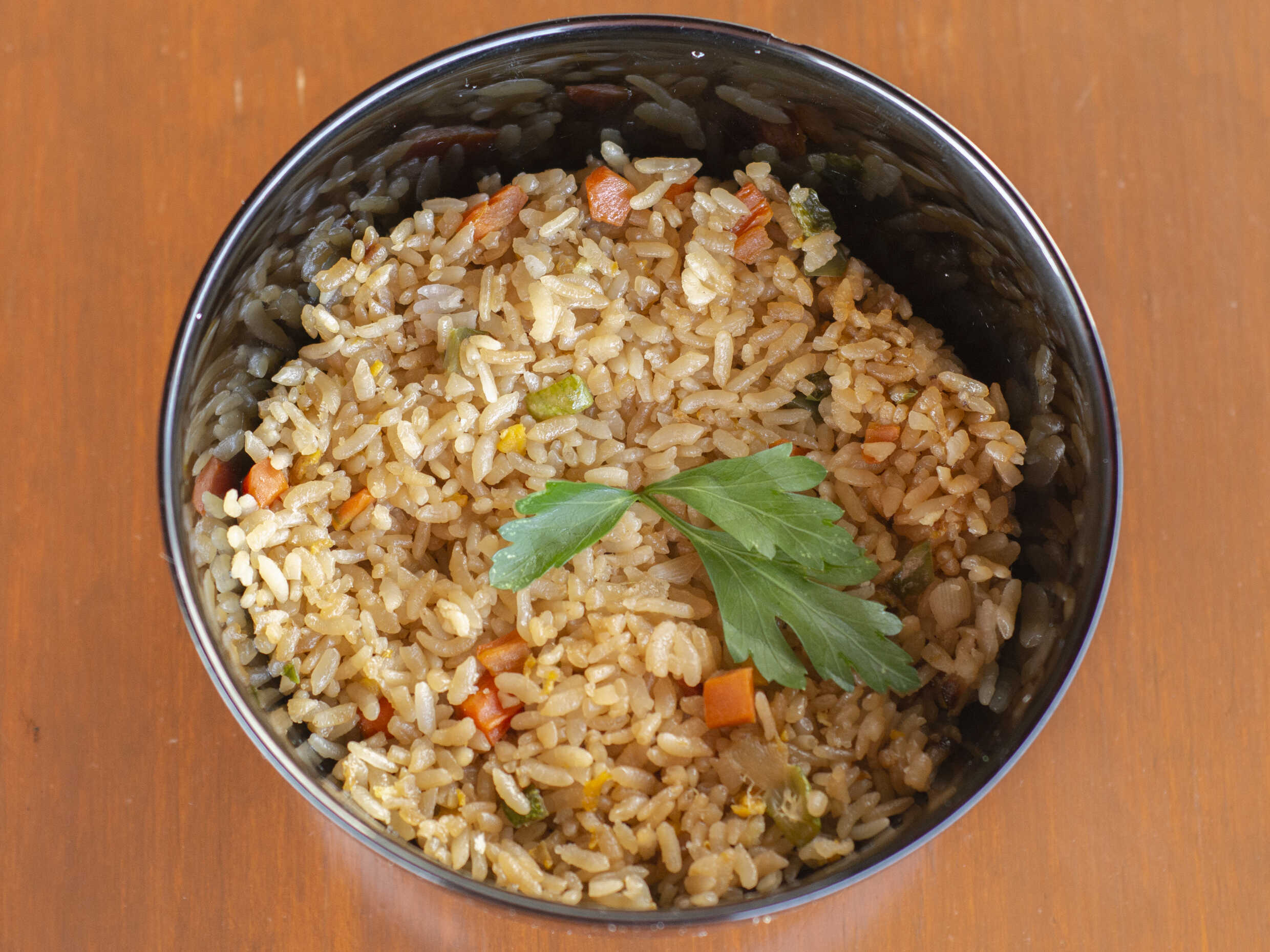Arroz frito sazonado a la plancha con verduras: cebolla calabaza ,zanahoria, morron y huevo