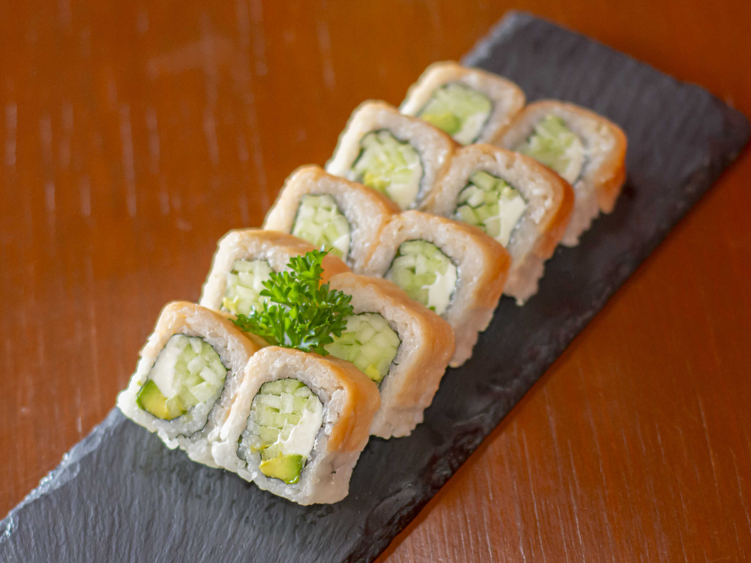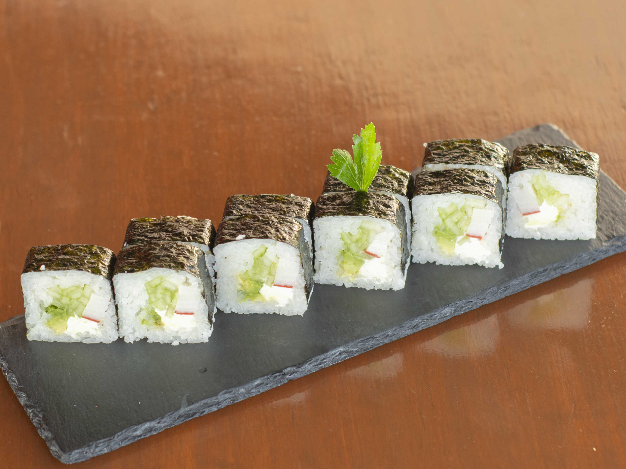 Rollo envuelto en alga con queso de philadephia, cangrejo pepino y aguacate por dentro , cortado en 10 pzas