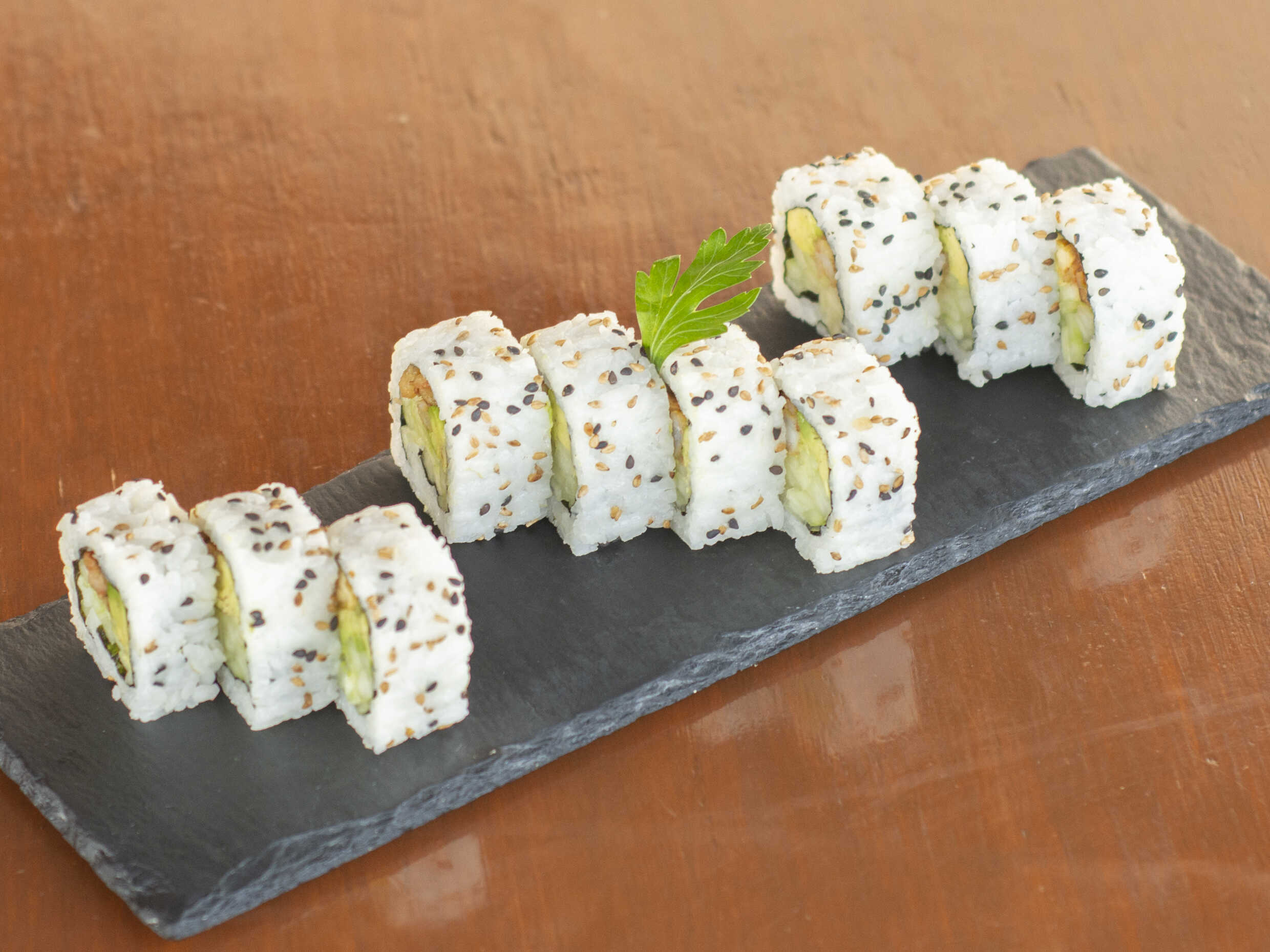 rollo envuelto en ajonjolí con pepino y aguacate por dentro cortado en 10 pzas