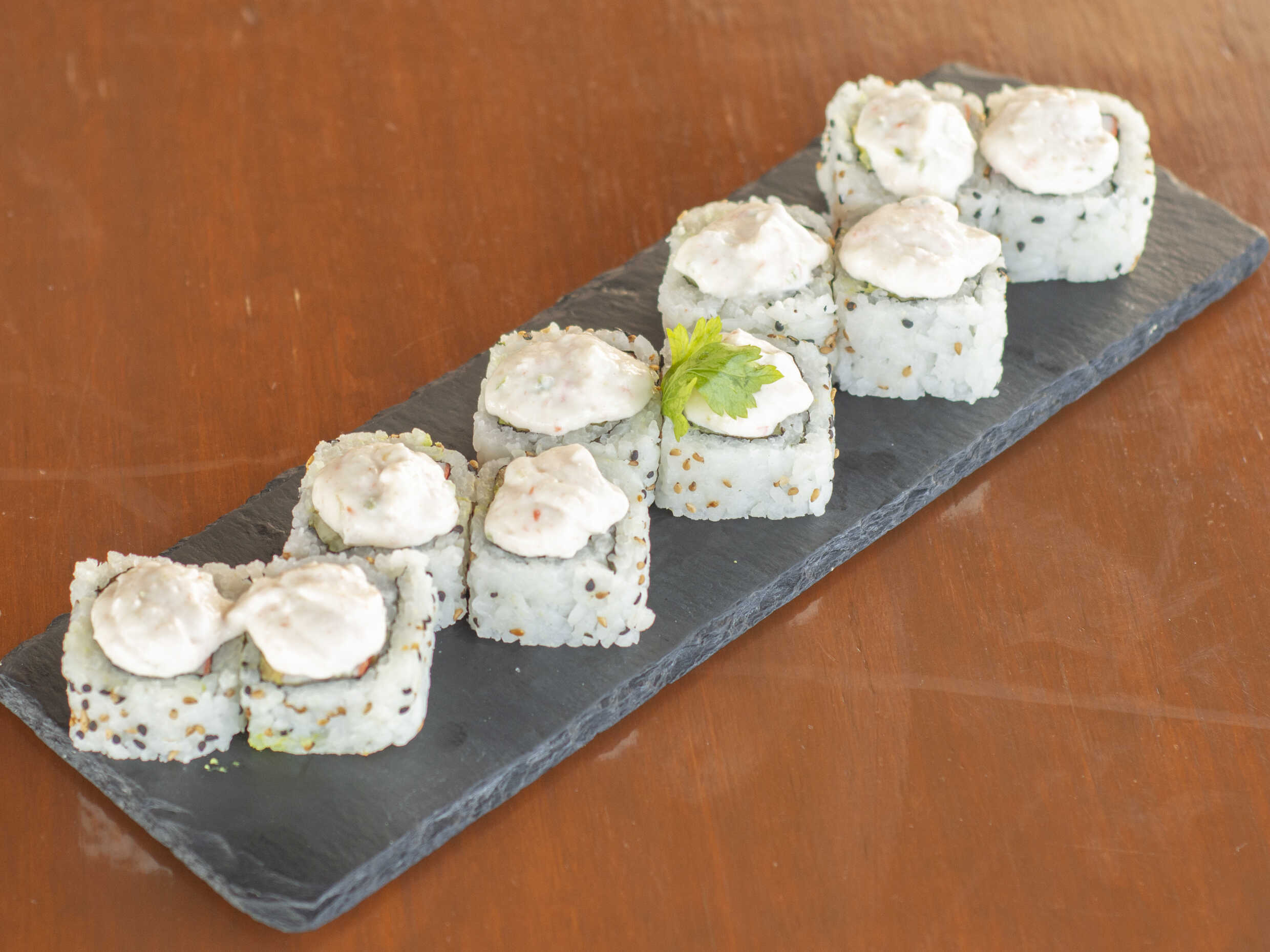 Rollo envuelto en ajonjolí con pepino, aguacate y cangrejo por dentro, con salsa tampico encima, cortado en 10 pzas