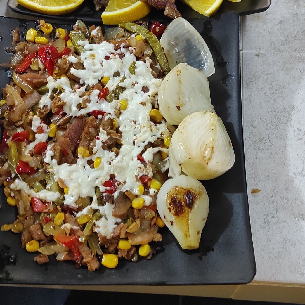 milanesa, bistec, chuleta, cebolla, morron, tocino, jamon, queso y granos de elote