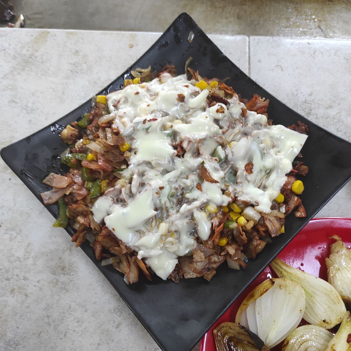 cebolla, morrón, tocino, jamón, queso