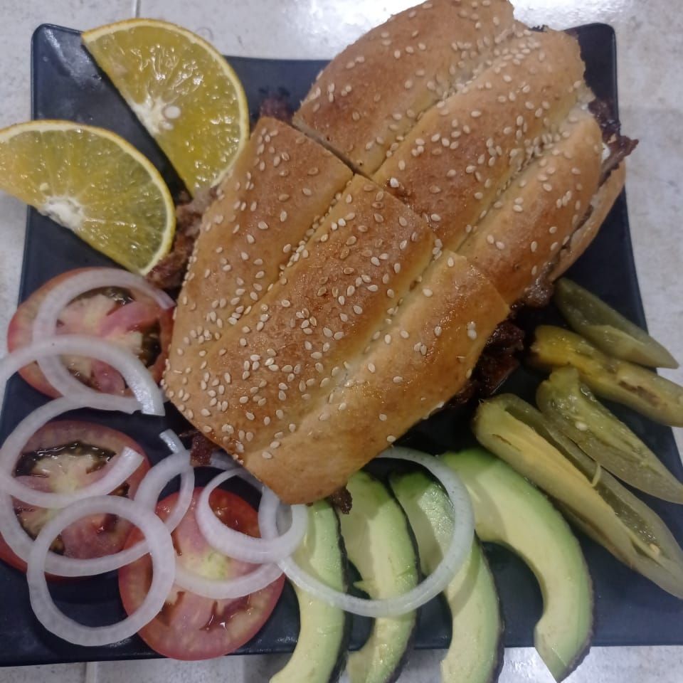 Pastor, Suadero, longaniza, chuleta, jamón, jitomate, cebolla, aguacate, chiles en vinagre, mayonesa y queso