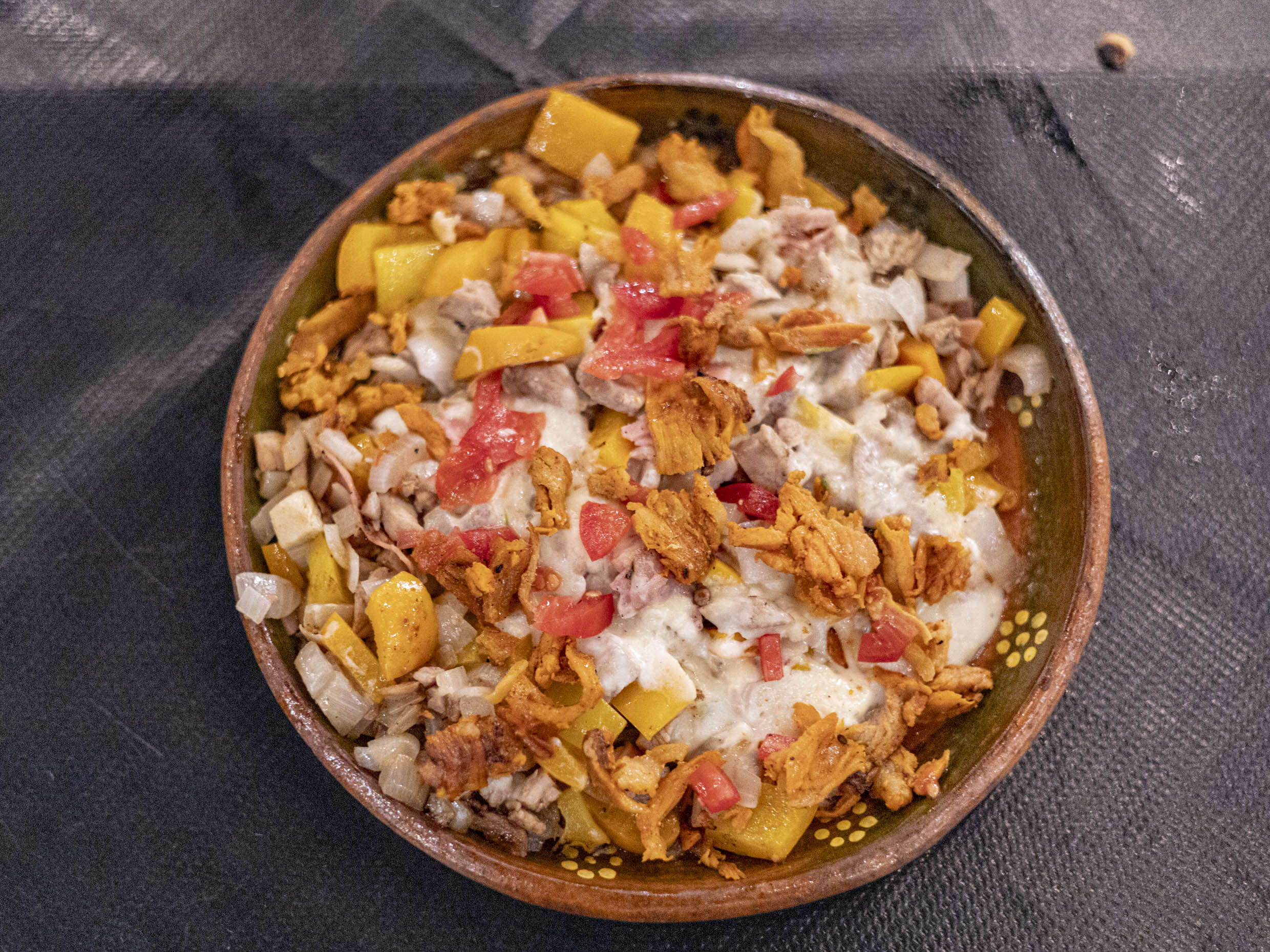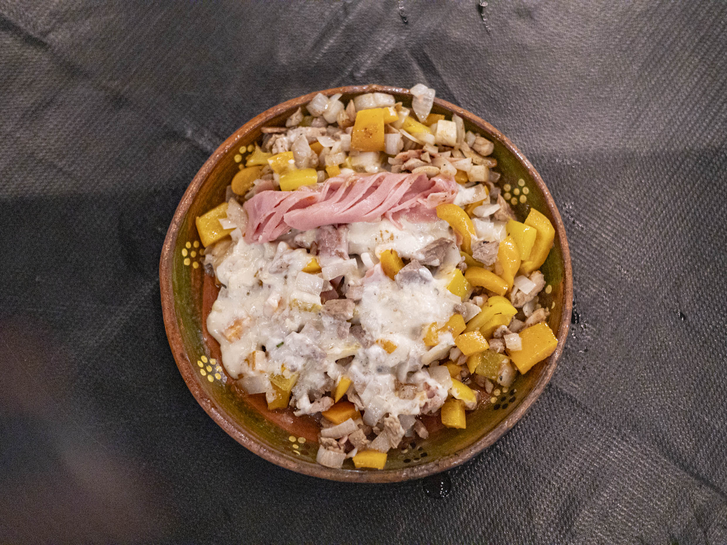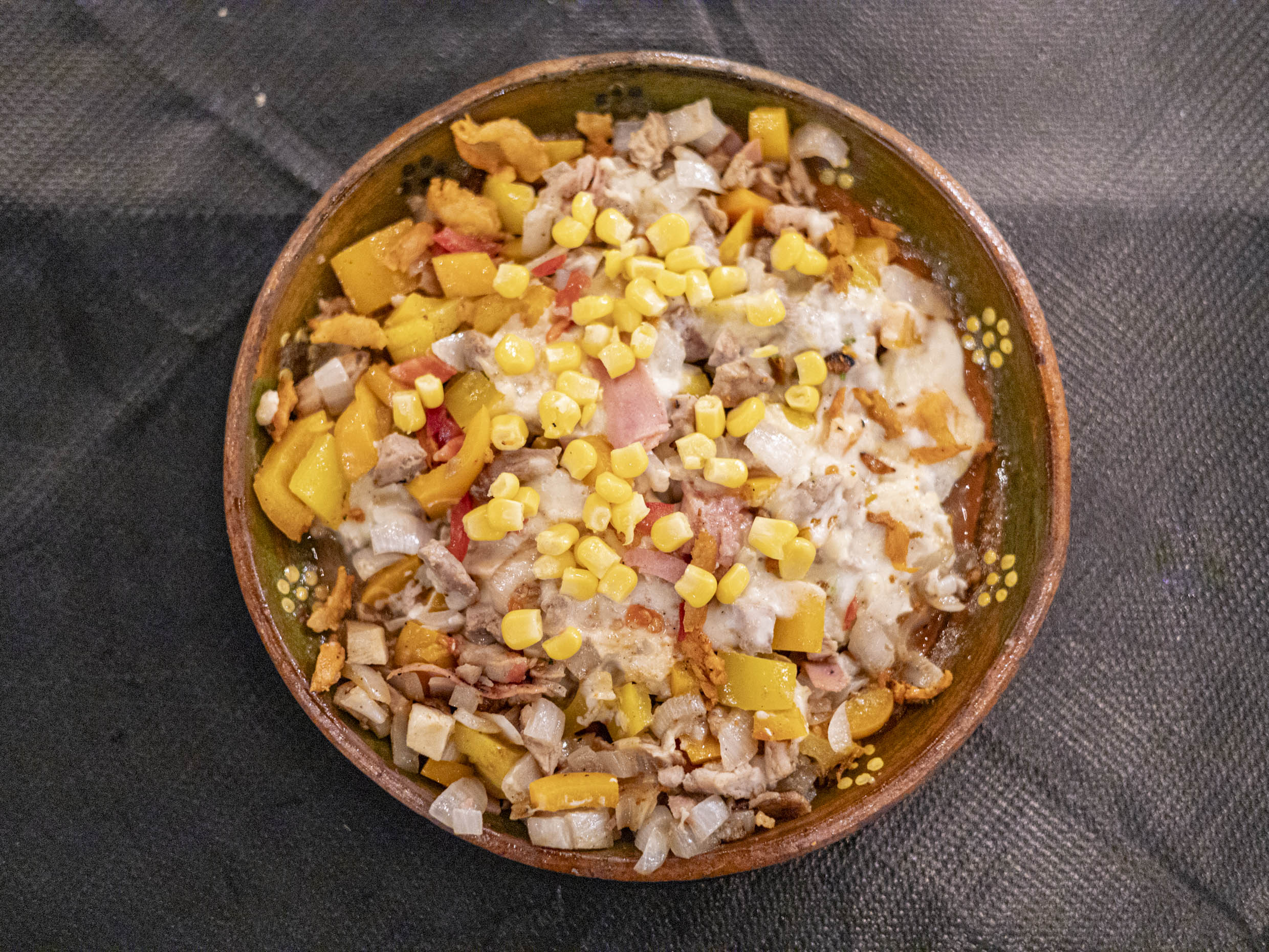 Cebolla, apio. champiñon, piña, costilla, elote y queso.
