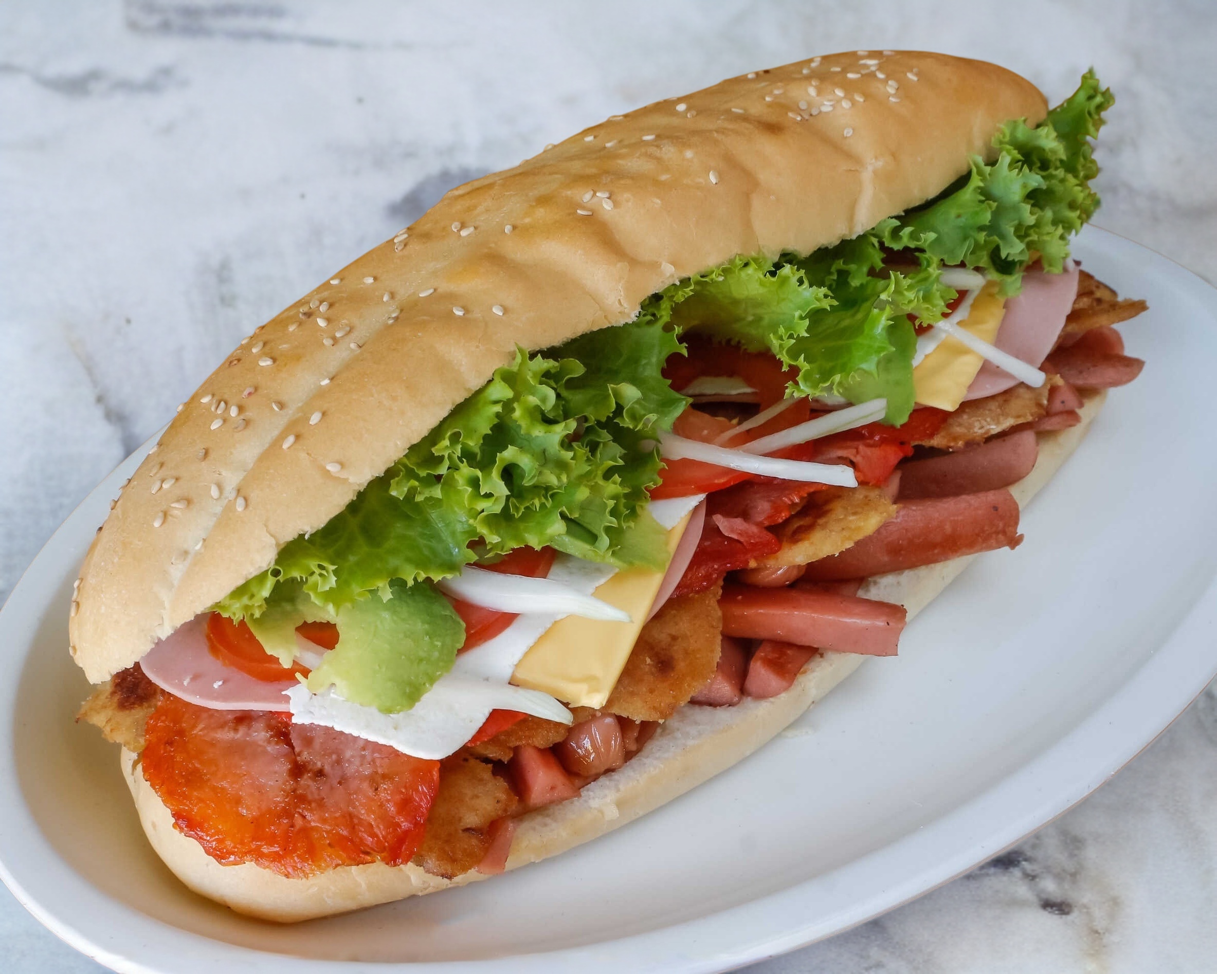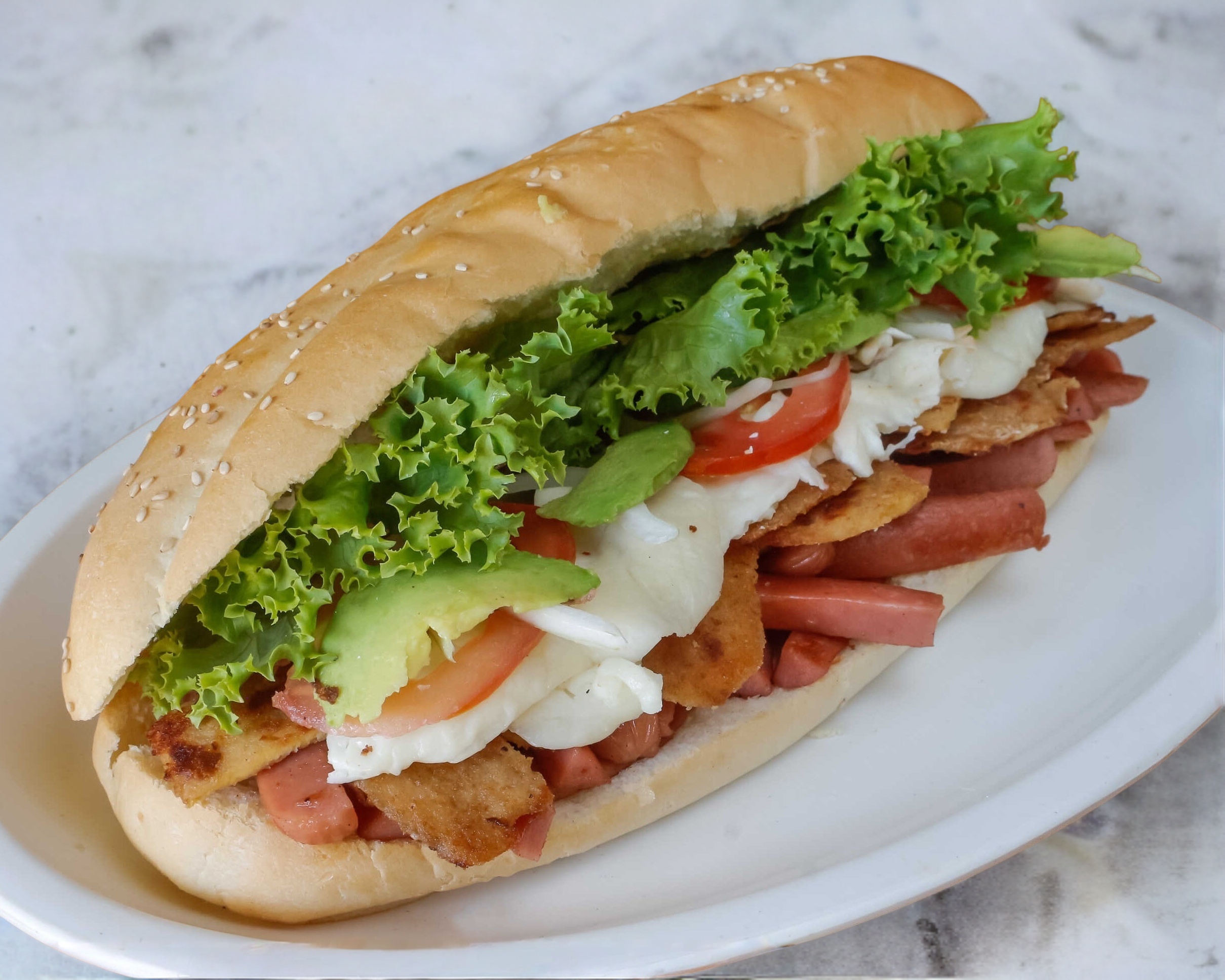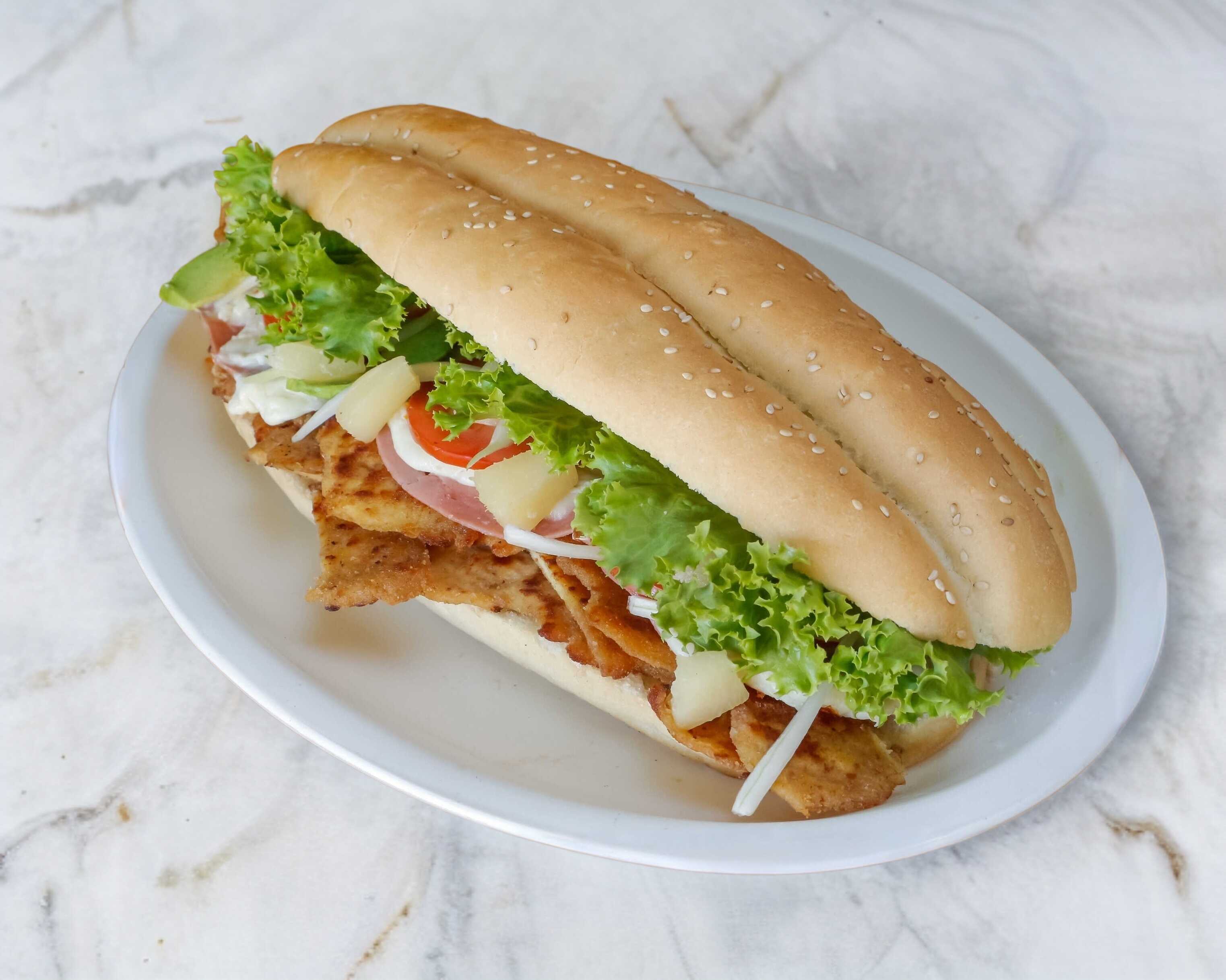 Milanesa, pierna, jamón, queso amarillo, queso blanco y huevo opcional.