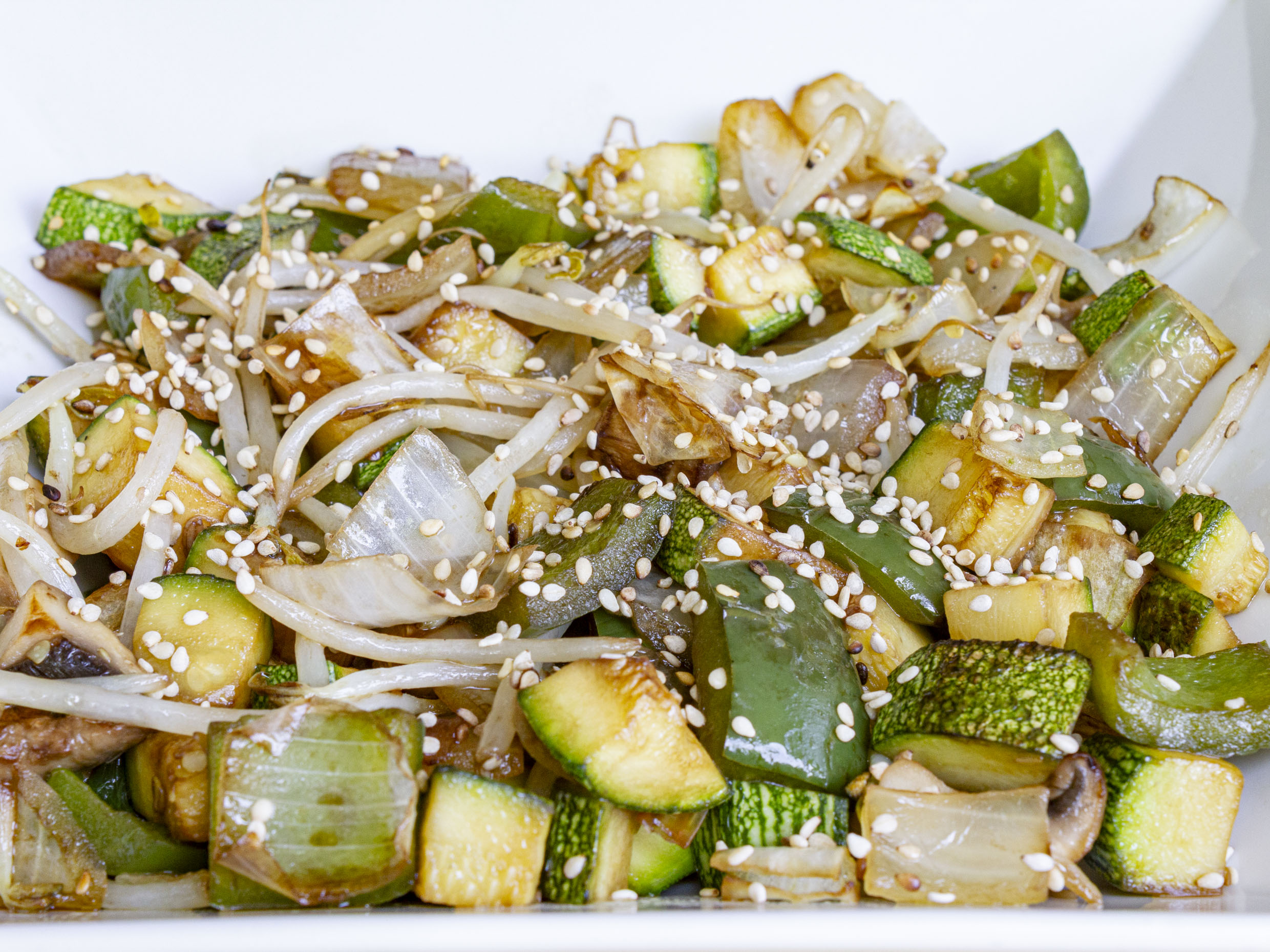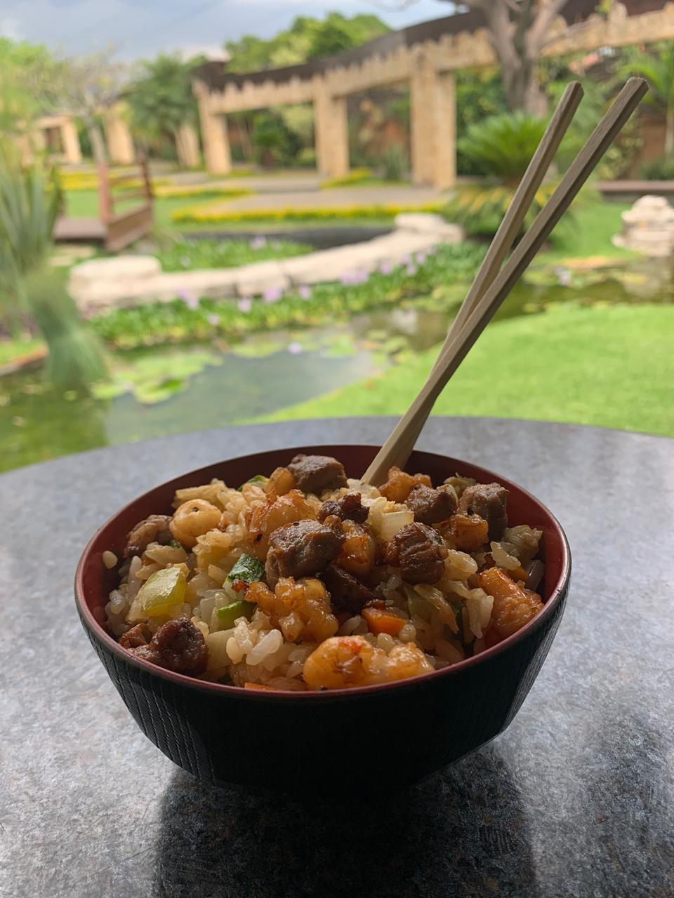 1 Rollito primavera, 2 yakitori de pollo, 1 maki philadelphia (ajonjolí por fuera, salmón fresco y queso crema por dentro) 1 yakimeshi de verduras.