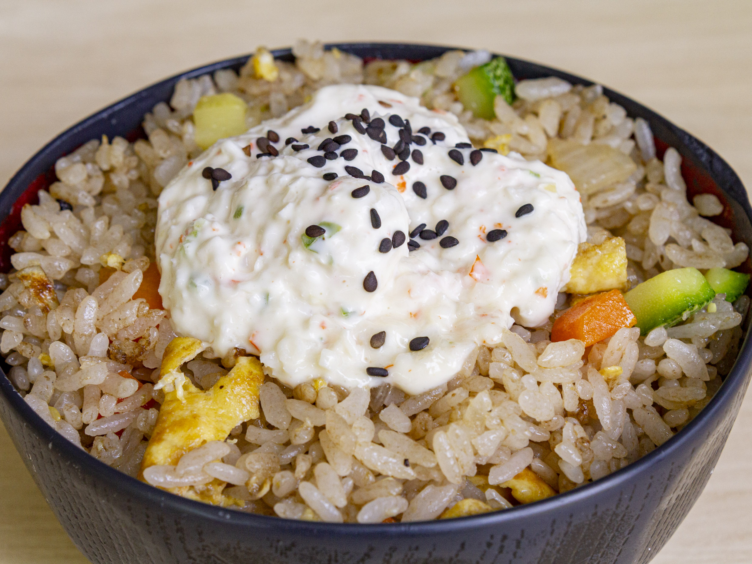 Yakimeshi con aguacate, tampico, queso crema y camaron empanizado