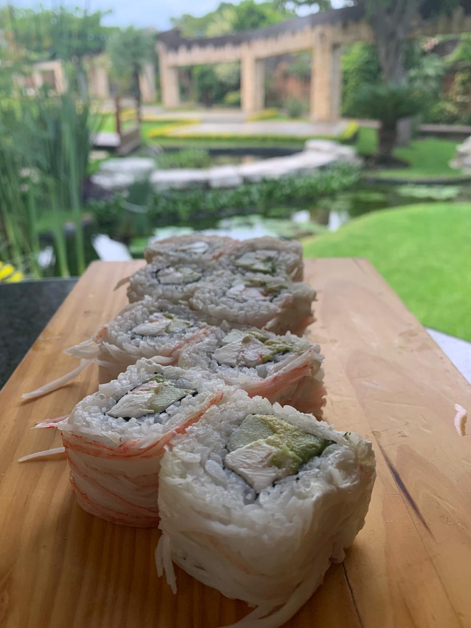 XF: pechuga de pollo y salsa teriyaki XD: pepino, queso crema y aguacate