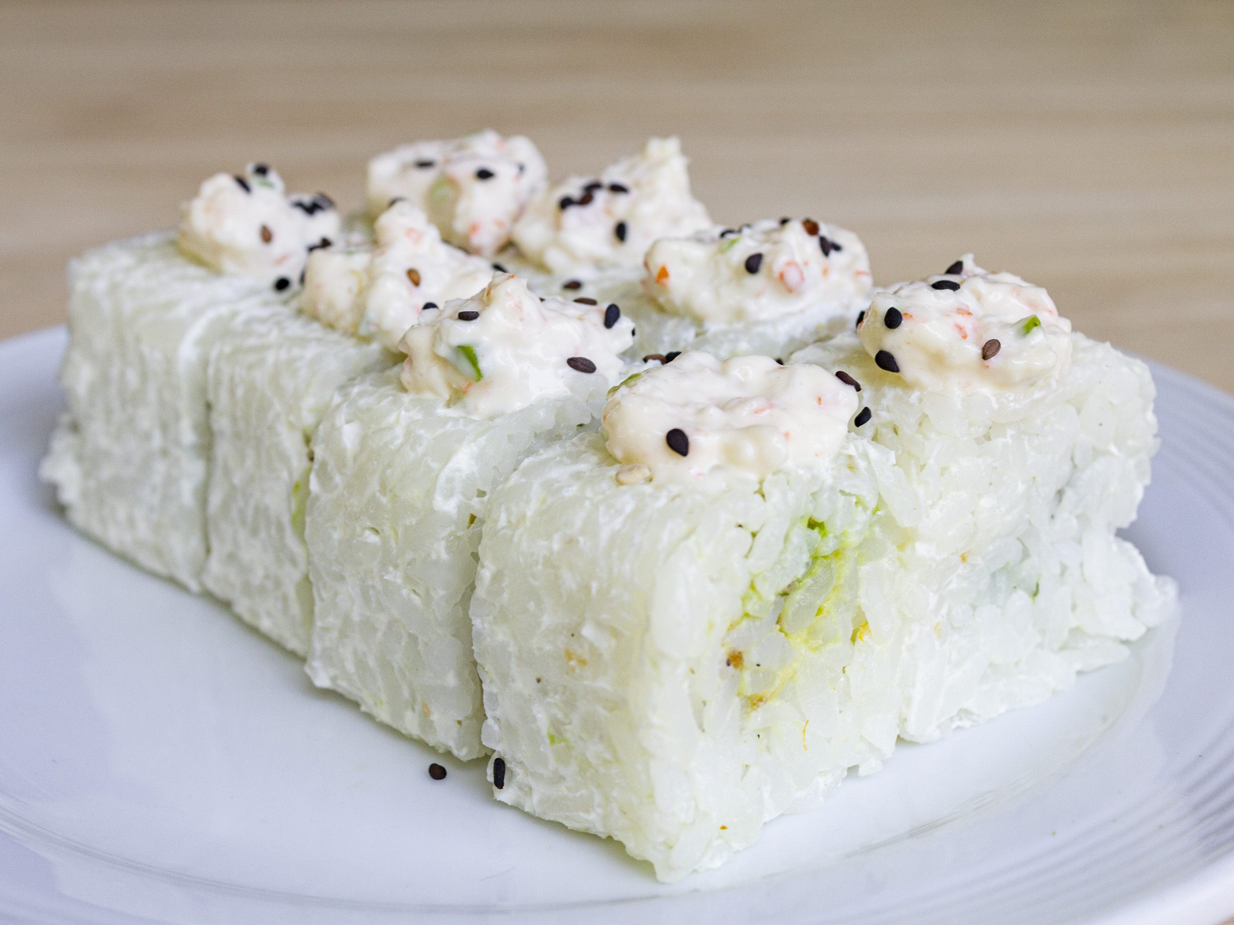 Empanizado por fuera, camarón, aguacate, pepino y queso crema por fuera con salsa tampico.