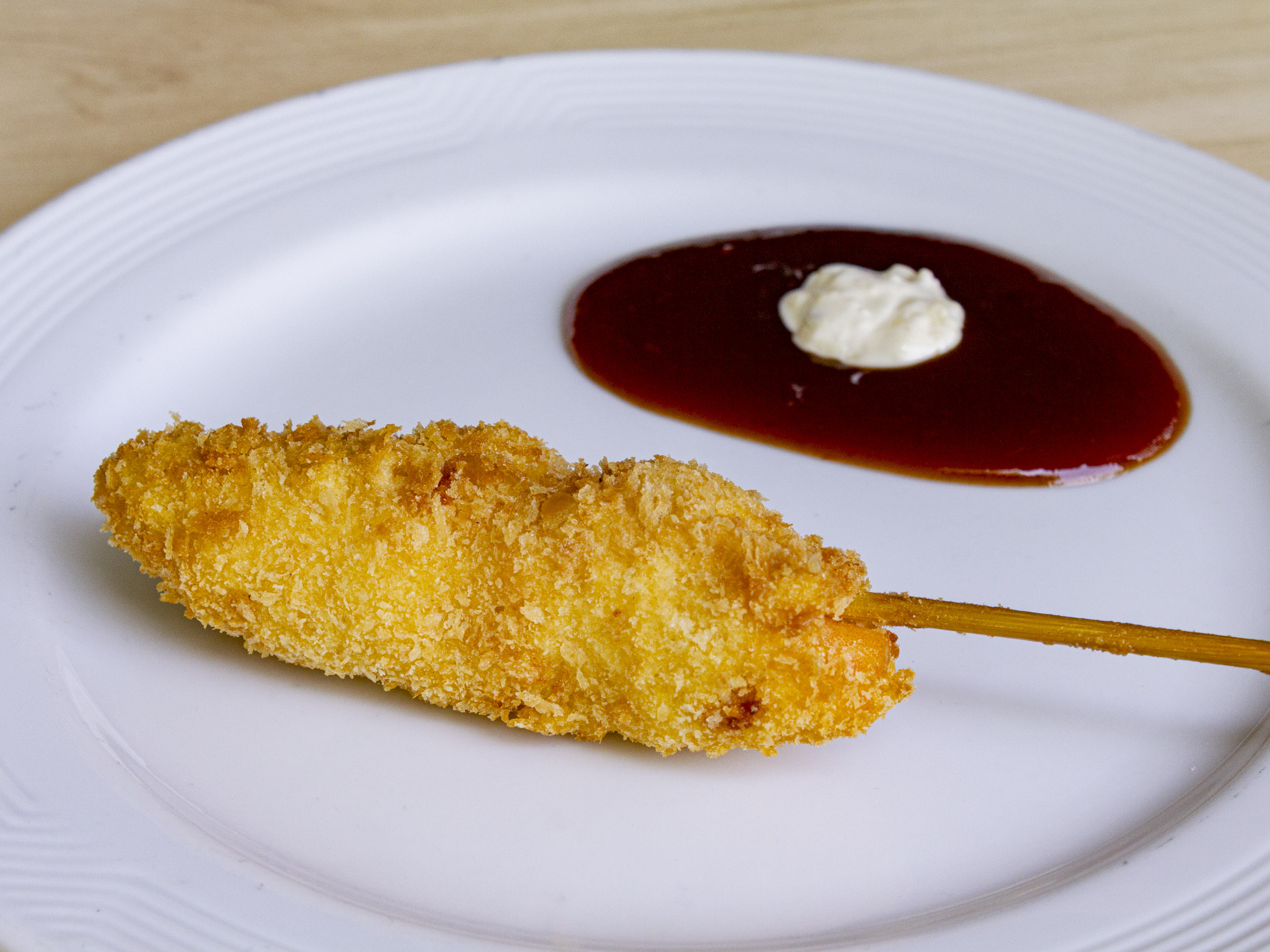 1 California con surimi, yakimeshi de verduras y 2 brocetas de platano con queso