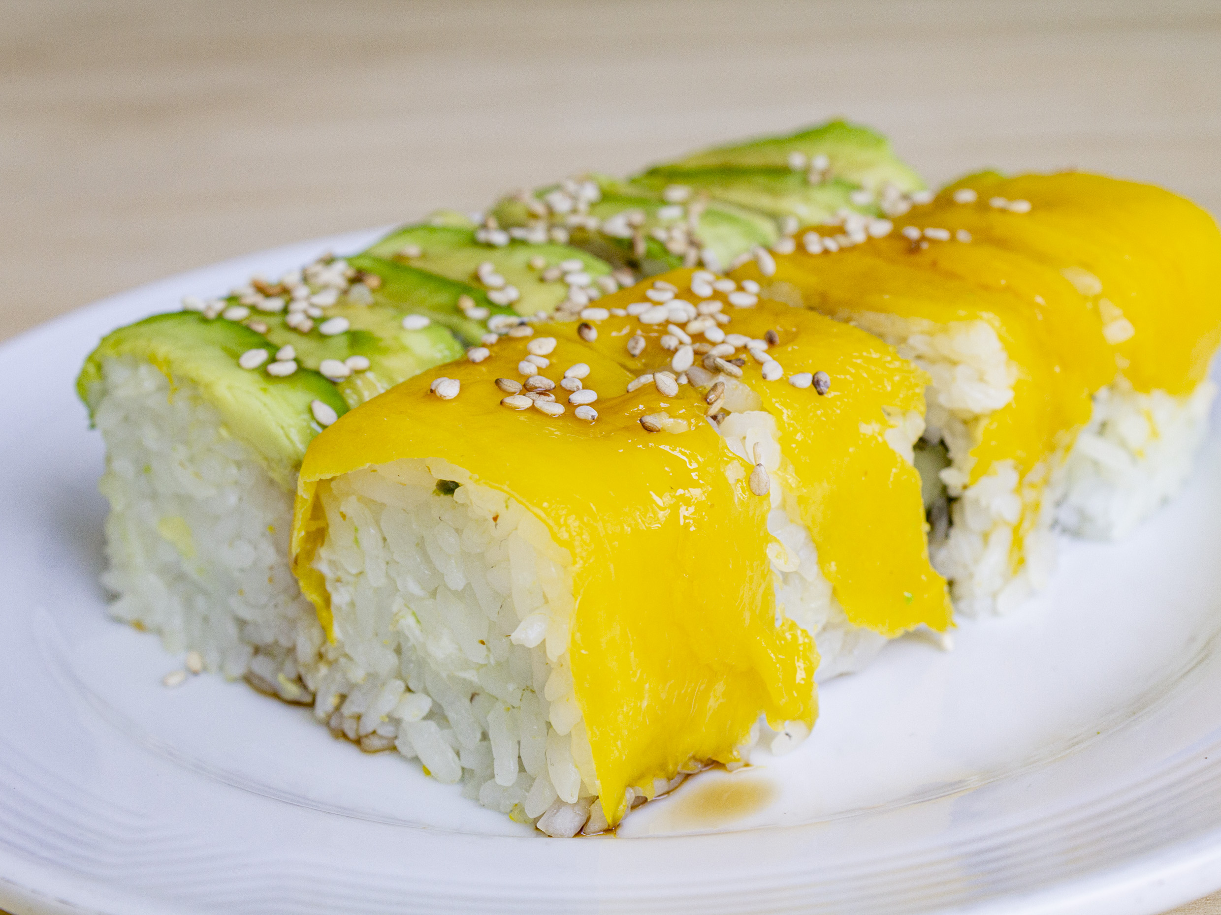 Mango por fuera, surimi empanizado, aguacate, pepino y queso crema con salsa dulce.