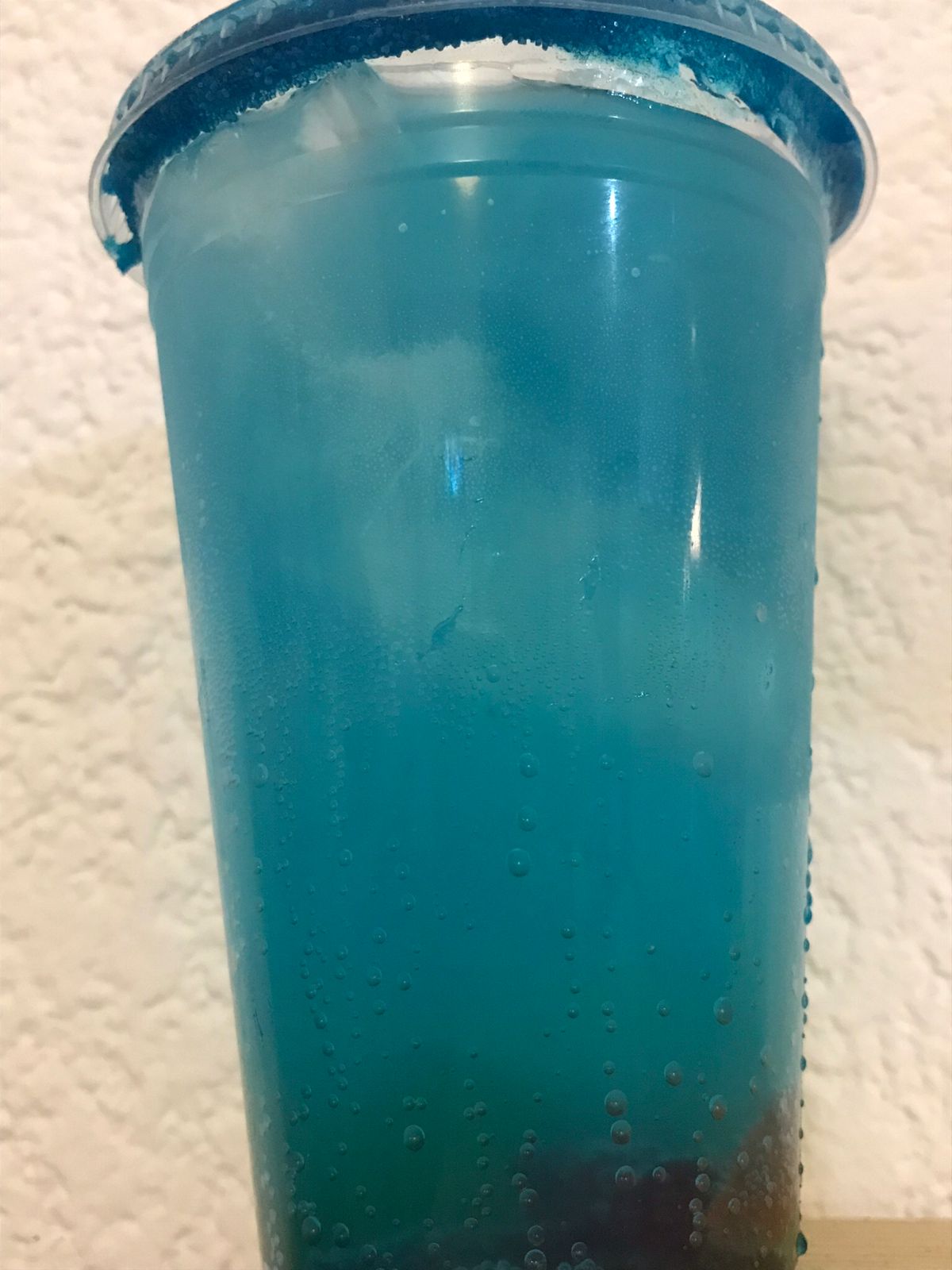 45ml de vodka, 180ml de Volt blue, gomitas, top de refresco de limón, saborizante de blue Berry, hielos