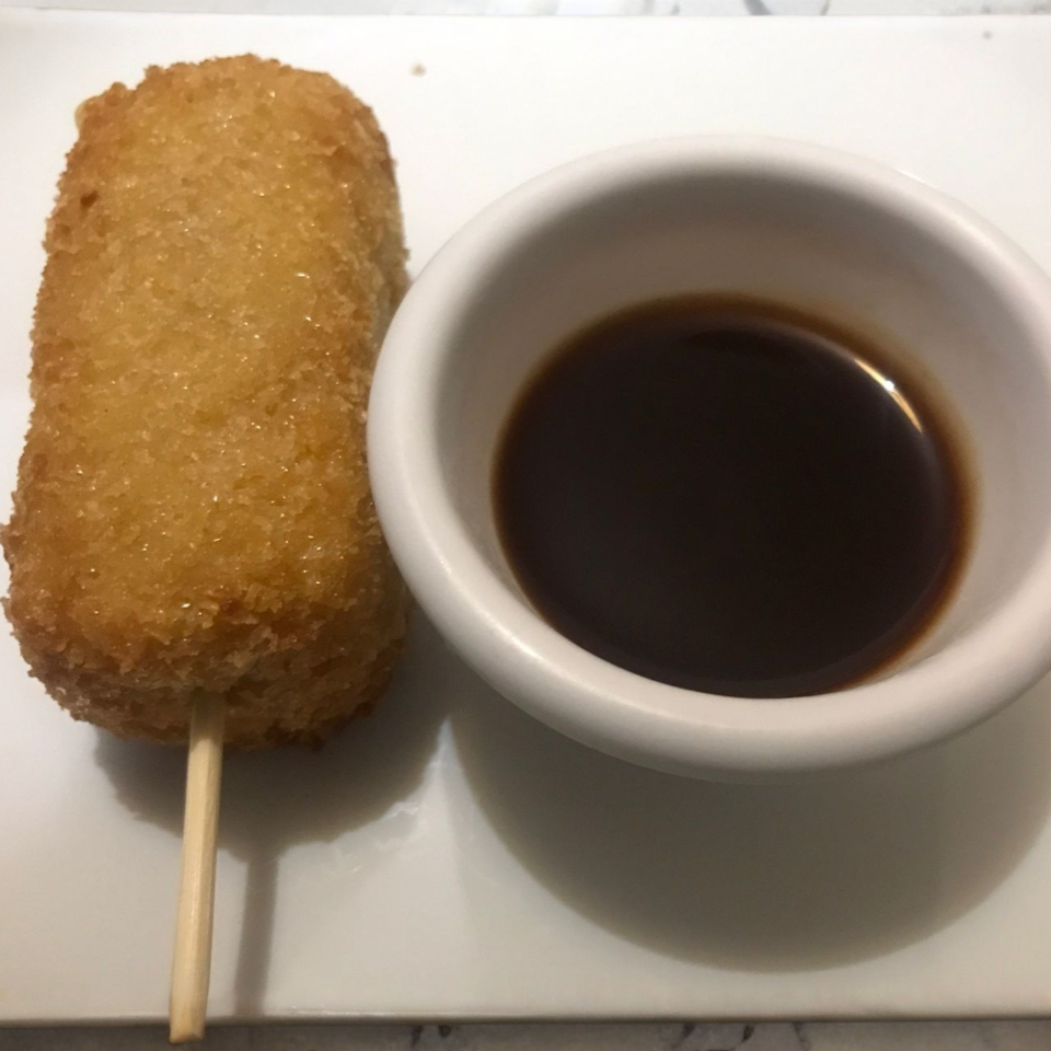 Rollo empanizado, salsa kushiage, por dentro queso manchego, aguacate, chiles toreados