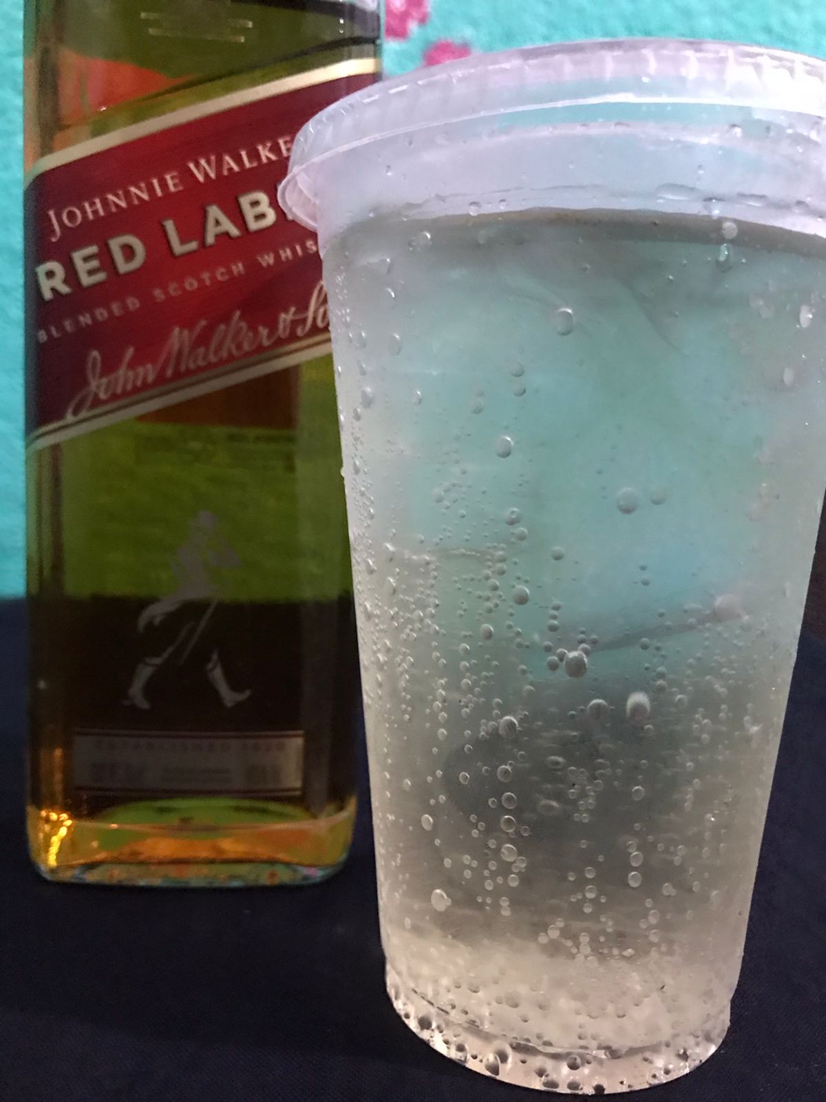 50ml de whisky etiqueta roja, agua mineral, hielos, servido en vaso de 500ml